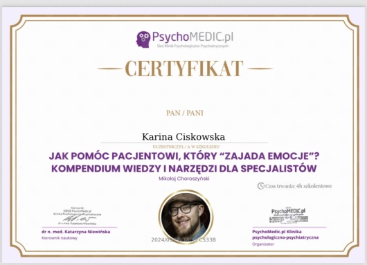 Z pełnym przekonaniem mogę polecić Panią Karinę, z którą miałam przyjemność współpracować. Każde nasze spotkanie odbywało się w atmosferze pełnej zaufania i akceptacji, co pozwalało mi czuć się swobodnie i otwarcie dzielić swoimi myślami oraz emocjami.