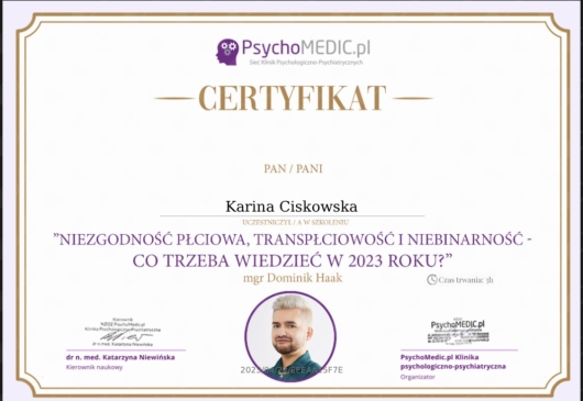 To najlepsza decyzja, która mogłam podjąć dla swojego rozwoju osobistego, pójście na terapię to naprawdę coś, czego potrzebowałam, dzięki Pani Karinie, która jest ciepłą osobą, udało mi się dostrzec bardzo dużo. Moje poczucie wartości wzrosło, czuję ze soba dobrze, czuję spokoj, który potrzebowałam.
