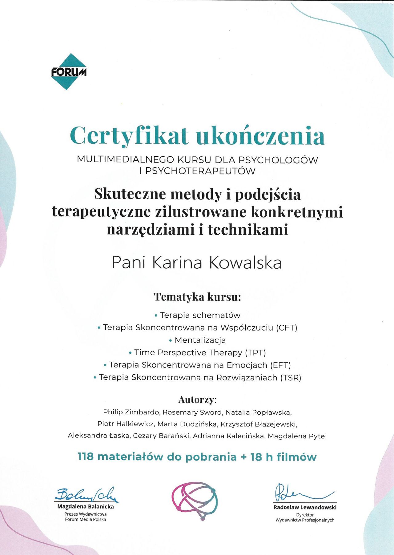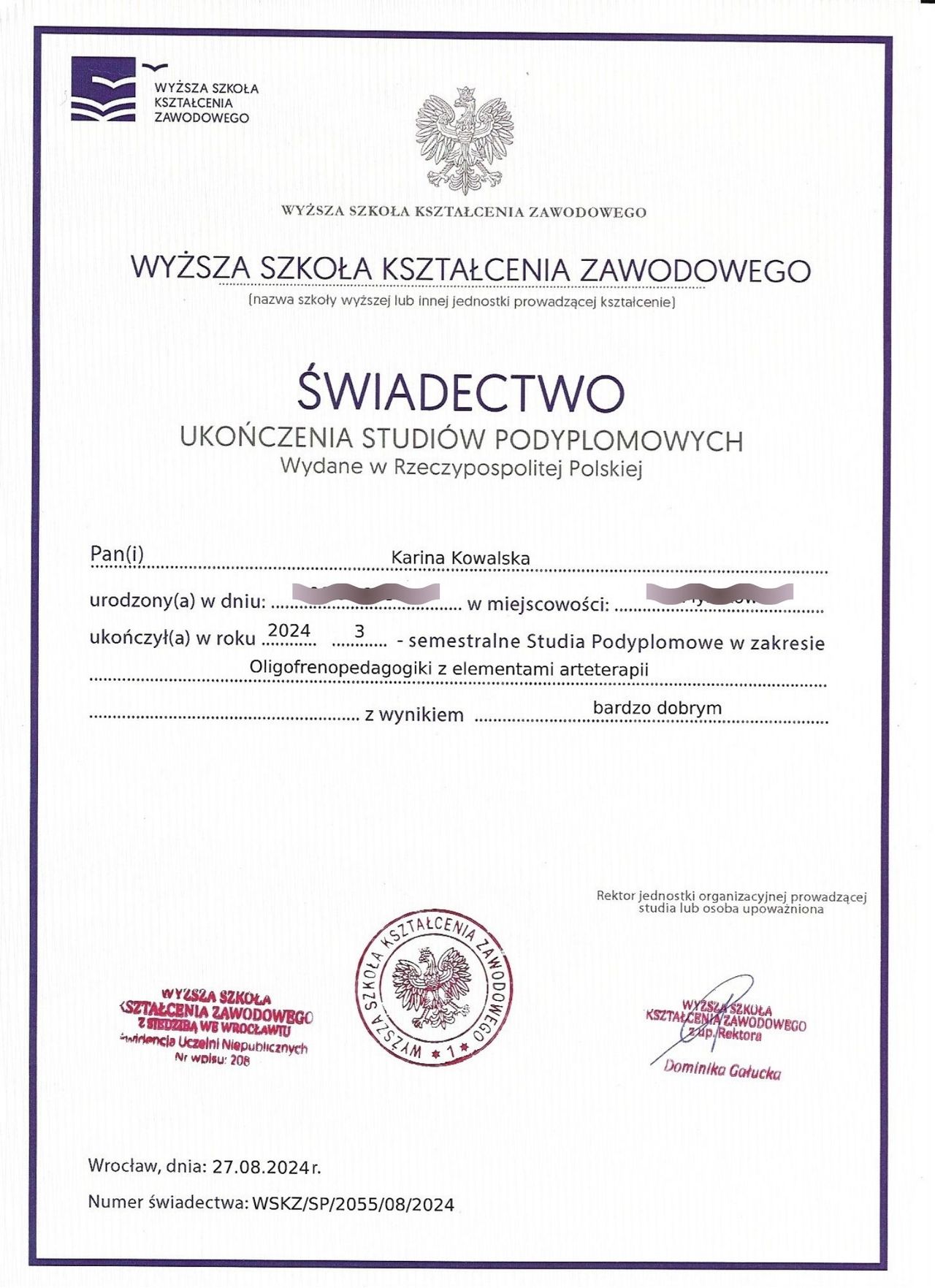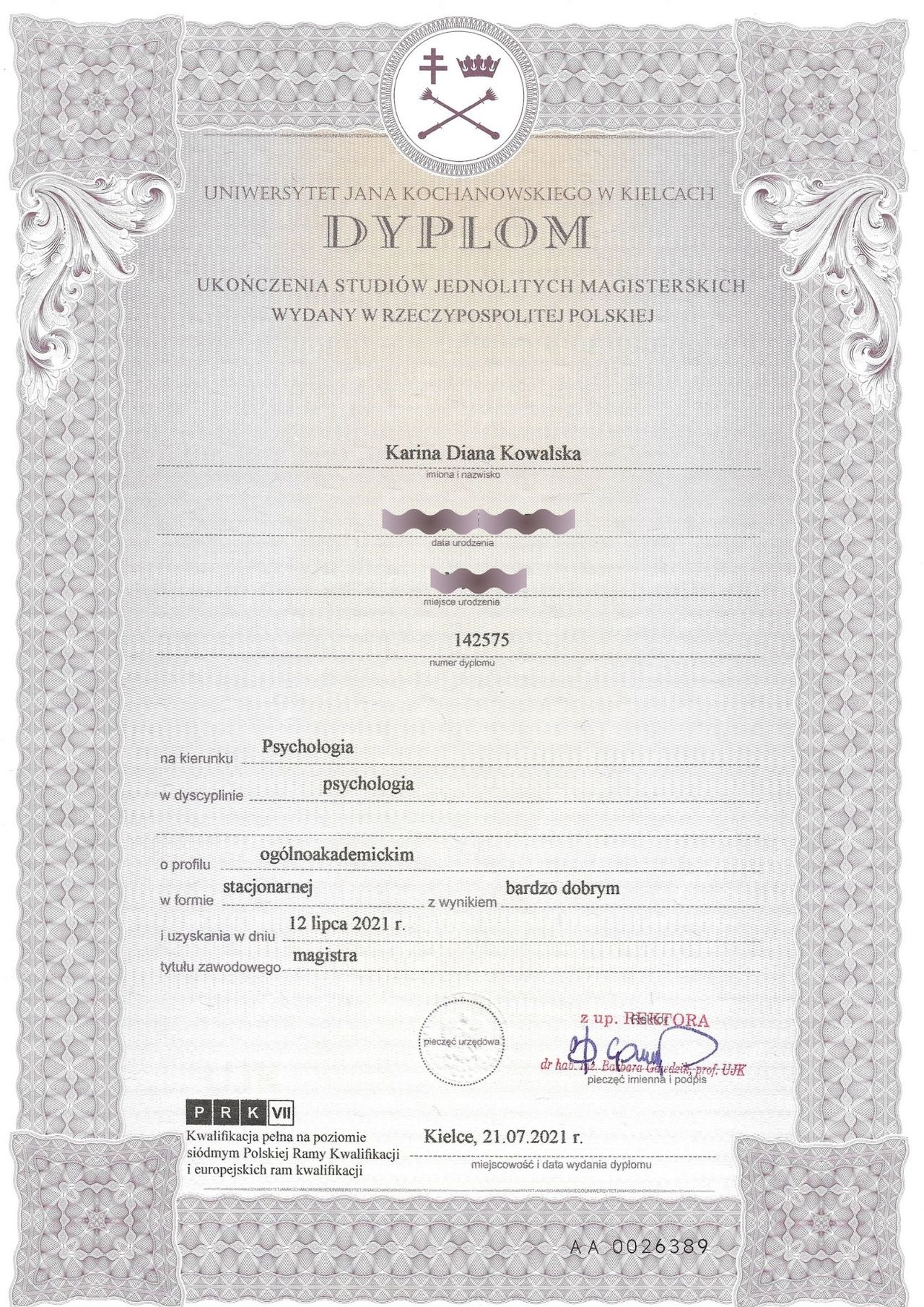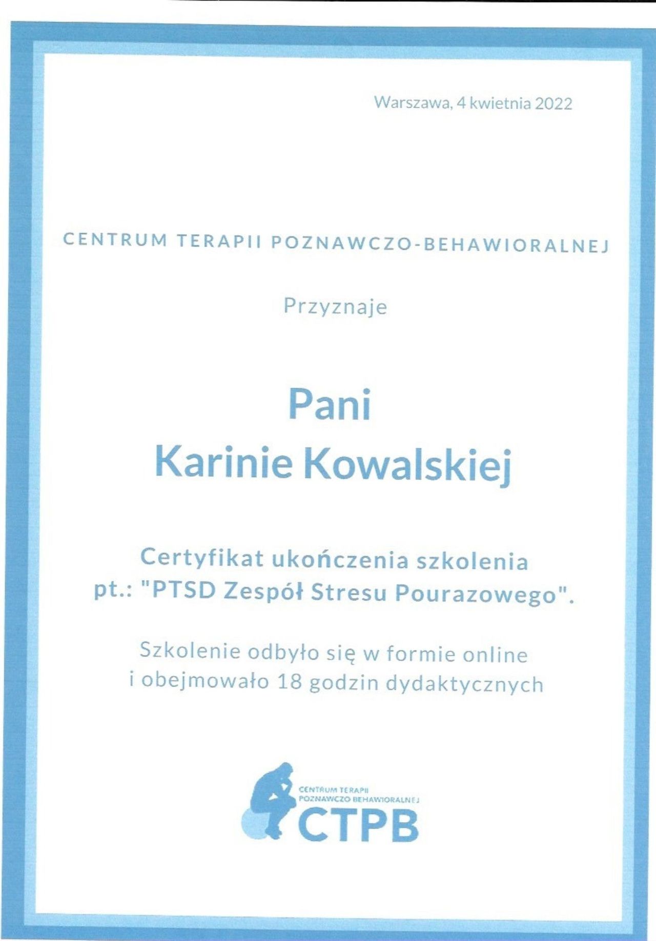 Jestem absolwentką 5 letnich studiów magisterskich na kierunku psychologia, o specjalności klinicznej. Ukończyłam studia podyplomowe z zakresu przygotowania pedagogicznego, oligofrenopedagogiki oraz arteterapii. Pozytywnie przeszłam szkolenie w Centrum Terapii Poznawczo-Behawioralnej w Warszawie ukierunkowane na pracę z osobami dotkniętymi Zespołem Stresu Pourazowego. Uzyskałam praktyczną certyfikację z zakresu Holistycznej terapii dzieci i młodzieży z zaburzeniami lękowymi. Zakończyłam certyfikacją szkolenie Skuteczne metody i podejścia terapeutyczne zilustrowane konkretnymi narzędziami i technikami - CFT - Terapia Skoncentrowana na Współczuciu, TRE, DBT, TSR, EFT, TPT tworzonej we współpracy z Philipem Zimbardo. Posiadam uprawnienia diagnostyczne do badania ilorazu inteligencji skalą Stanford-Binet 5.
