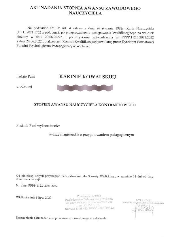 Pani Karina bardzo pomogła nam w procesie adaptacji naszego syna w placówce. Nie tylko jej fachowa wiedza (przekazana w bardzo przystępny sposób), ale równocześnie szczera chęć niesienia pomocy, empatia i wyrozumiałość, pozwoliły nam rozwiązać wszelkie nurtujące nas kwestie. Pani Karina to właściwa osoba we właściwym miejscu, a jako fachowiec najwyższej klasy - zdecydowanie godny polecenia.