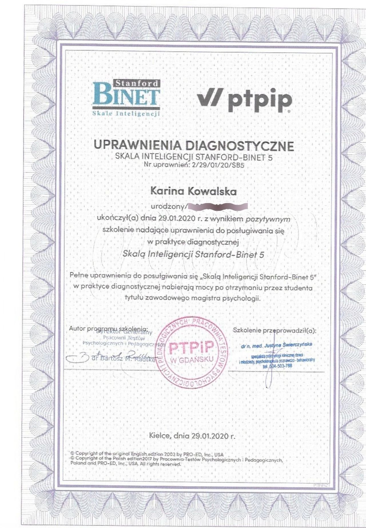 - przeprowadzaniu badań diagnostycznych mających na celu określenie poziomu rozwoju poznawczego, zwłaszcza rozwoju intelektualnego metodą Stanford Binet 5, - diagnozie i terapii psychologicznej wobec zgłaszanych problemów z agresją, separacją, adaptacją do nowych sytuacji;