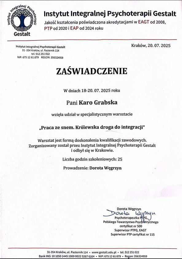 W pracy wykorzystuję również pracę ze snami, pomagając odkrywać ich osobiste znaczenie i to, co mogą mówić o wewnętrznym świecie.
