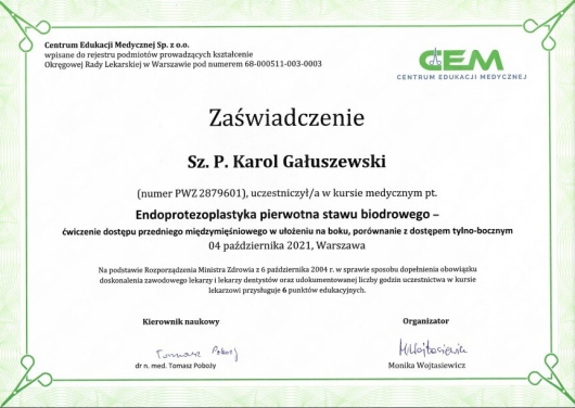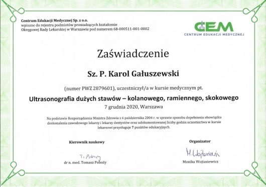 Jaki jest zakres porad oferowanych przez Karol Gałuszewski?Karol Gałuszewski to ortopeda. Na podstawie swojego doświadczenia i wykształcenia Karol Gałuszewski oferuje usługi takie jak: konsultacja ortopedyczna, konsultacja ortopedyczna + USG, iniekcja dostawowa, blokady dostawowe, Iniekcje z kwasu hialuronowego, punkcja stawów.