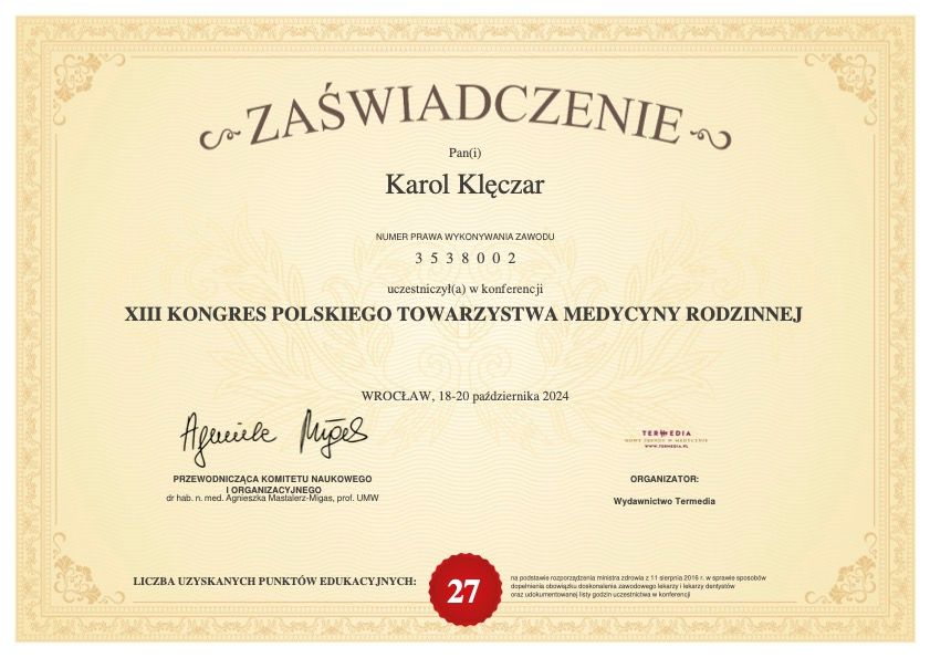 Jest to nie tylko mój Najlepszy lekarz rodzinny ale prawdziwy ekspert w dziedzinie, postawienia poprawnej diagnozy. Pan Karol to lekarz z powołania, który potrafi wysłuchać pacjenta ale co najważniejsze to widać, jak bardzo zależy aby pacjent czuł,że nie zostanie pozostawiony sam sobie. W moim przypadku to prawdziwy Anioł, pomógł mi wyjść z problemu zdrowotnego z którym borykałam się przez dwa lata, chodząc po różnych specjalistach. Jeśli ktokolwiek potrzebuje pomocy , to z czystym sumieniem i od serca polecam wizytę u Pana Karola. To nie tylko lekarz, to człowiek o złotym sercu, pozytywnym nastawieniu i stawiający w 100%, poprawna diagnozę. Jestem bardzo wdzięczna za pomoc w postawieniu diagnozy i pokazaniu,że da jeszcze lekarze, którzy służą nie tylko specjalizacją ale także sercem!