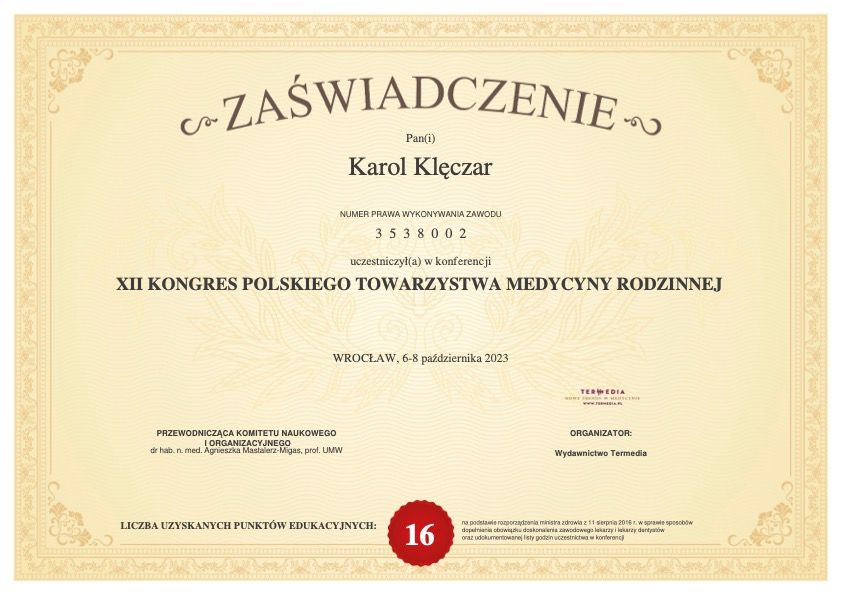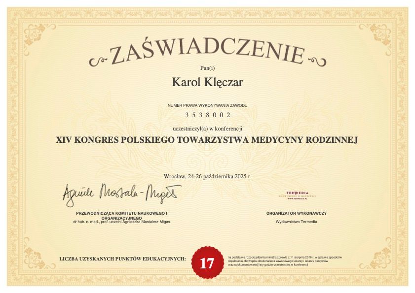 Czy Karol Klęczar przyjmuje online, bez konieczności pojawiania się w placówce?Tak, Karol Klęczar oferuje konsultacje online. Wybierz opcję „konsultacja online” przy umawianiu wizyty, a zobaczysz dostępne terminy.