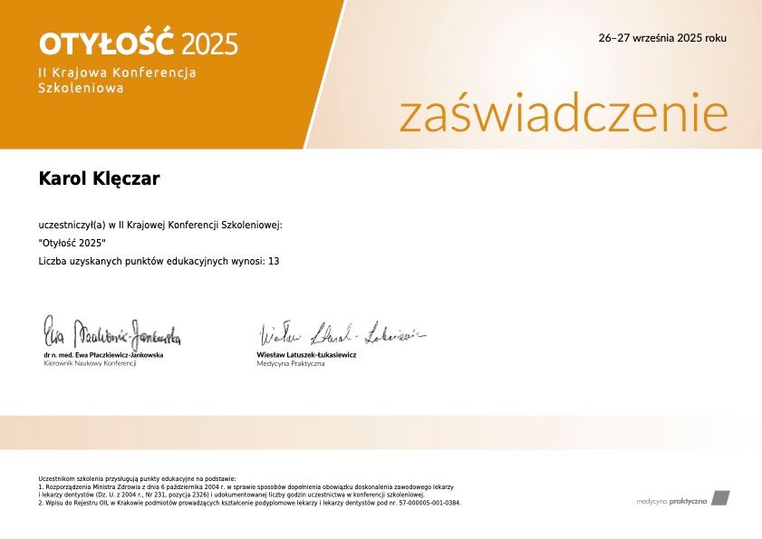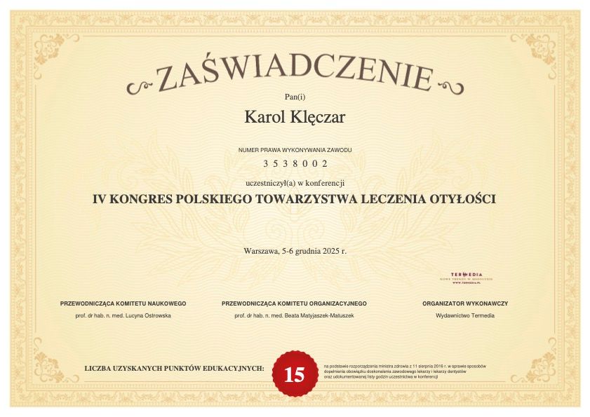 Jaki jest zakres porad oferowanych przez Karol Klęczar?Karol Klęczar to w trakcie specjalizacji (lekarz rodzinny). Na podstawie swojego doświadczenia i wykształcenia Karol Klęczar oferuje usługi takie jak: farmakologiczne leczenie otyłości, Konsultacja obesitologiczna (leczenie otyłości), leczenie otyłości, Konsultacja leczenia nadwagi i otyłości, konsultacja online.