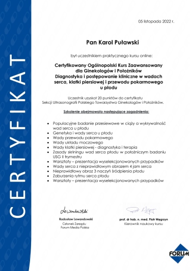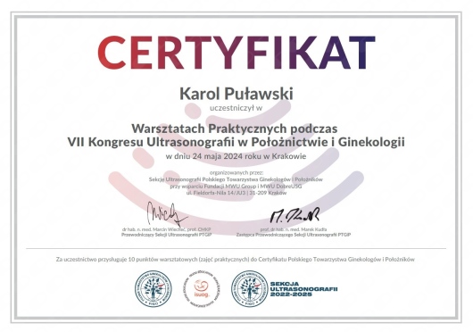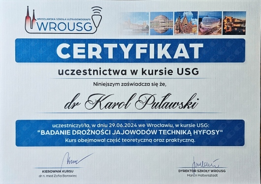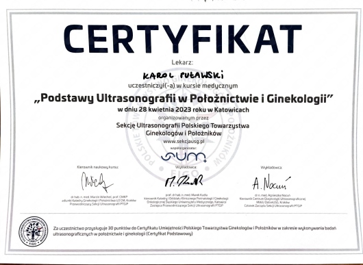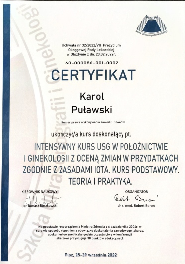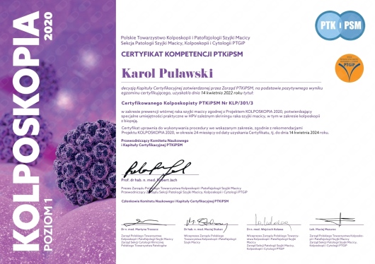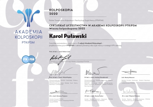 Jestem członkiem Polskiego Towarzystwa Ginekologów i Położników oraz certyfikowanym kolposkopistą Polskiego Towarzystwa Kolposkopii i Patologii Szyjki Macicy.
