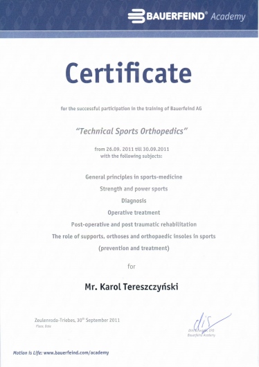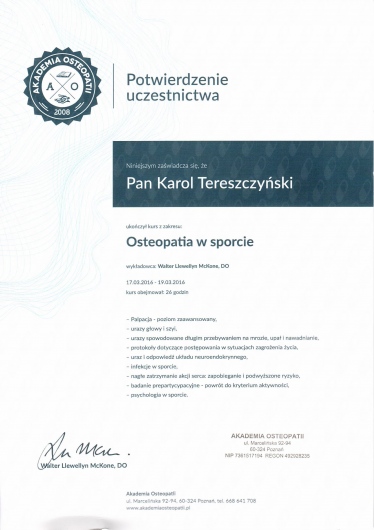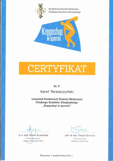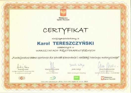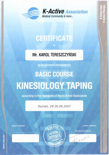 Uczestnik wielu kursów i szkoleń fizjoterapeutycznych, m.in. kursy tkanek miękkich, kinesiology taping, FMS (Funkcjonalna ocena sportowca dla potrzeb planowania i realizacji treningu motorycznego).