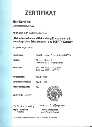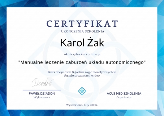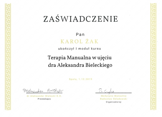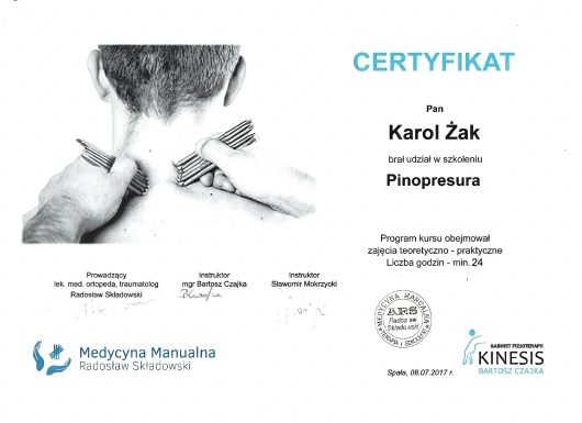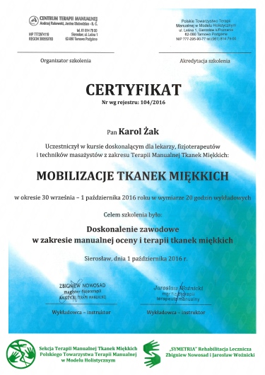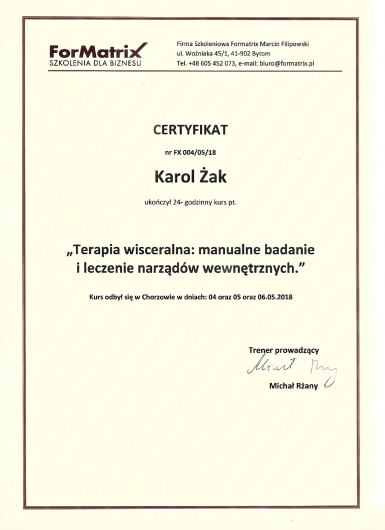 Ponadto ukończył kursy i szkolenia doszkalające z zakresu terapii manualnej, terapii tkanek miękkich, drenażu limfatycznego, pinoterapii, terapii stawów skroniowo-żuchwowych oraz badań obrazowych.