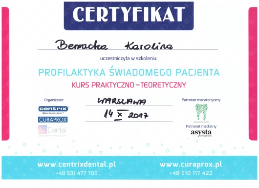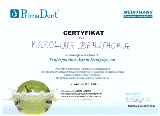 W klinice wykonuje pełen zakres higienizacji scaling, piaskowanie, fluoryzacja oraz wybielanie gabinetowe i metodą nakładkowa.Cechuje ją spokój, opanowanie i doskonały kontakt z Pacjentem. Asystuje głównie przy zabiegach chirurgicznych i implantologicznych obejmując Pacjenta opieka pozabiegową
