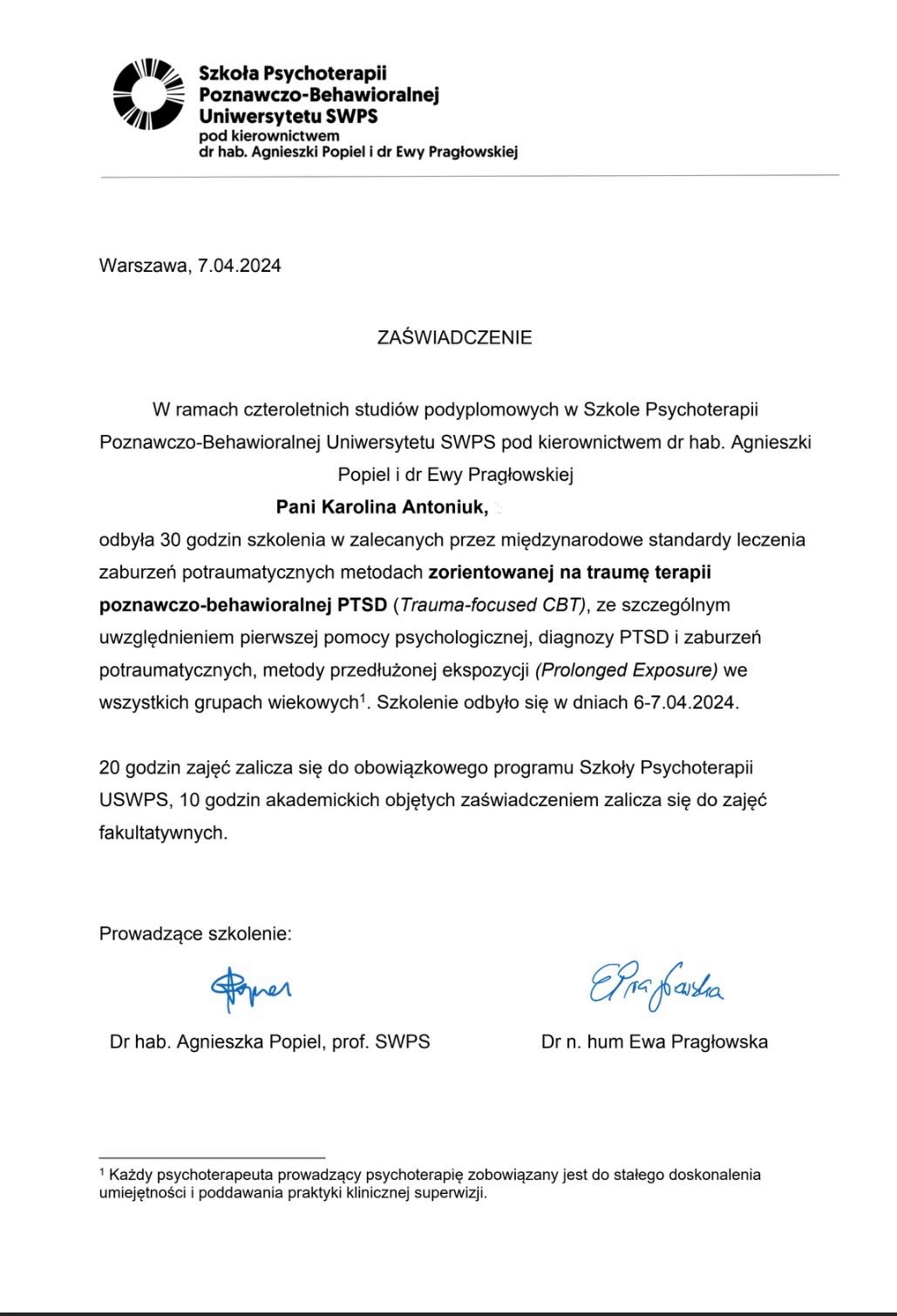 Jestem bardzo wdzięczna Pani Justynie za to, co razem udało nam się osiągnąć przez te pół roku terapii. Przyszłam zmagając się z silnymi lękami, a dziś wychodzę jako spokojniejsza, bardziej pewna siebie osoba. Pani Justyna stworzyła atmosferę zaufania i zrozumienia, w której mogłam poczuć się bezpiecznie i szczerze mówić o swoich trudnościach.