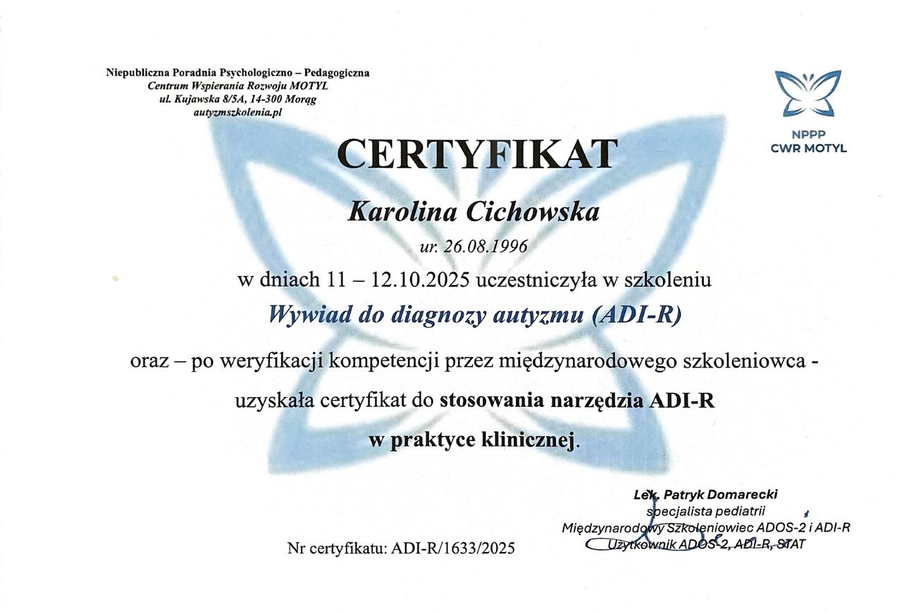 Jestem psychologiem, specjalizującym się we wspieraniu rozwoju emocjonalnego, społecznego i edukacyjnego dzieci. Moje podejście opiera się na zrozumieniu indywidualnych potrzeb dziecka oraz uwzględnieniu jego rodzinnego i środowiskowego kontekstu. Ukończyłam studia psychologiczne, a także studia z zakresu pedagogiki wczesnoszkolnej i przedszkolnej. Wiedzę pogłębiałam na studiach podyplomowych m.in. z: