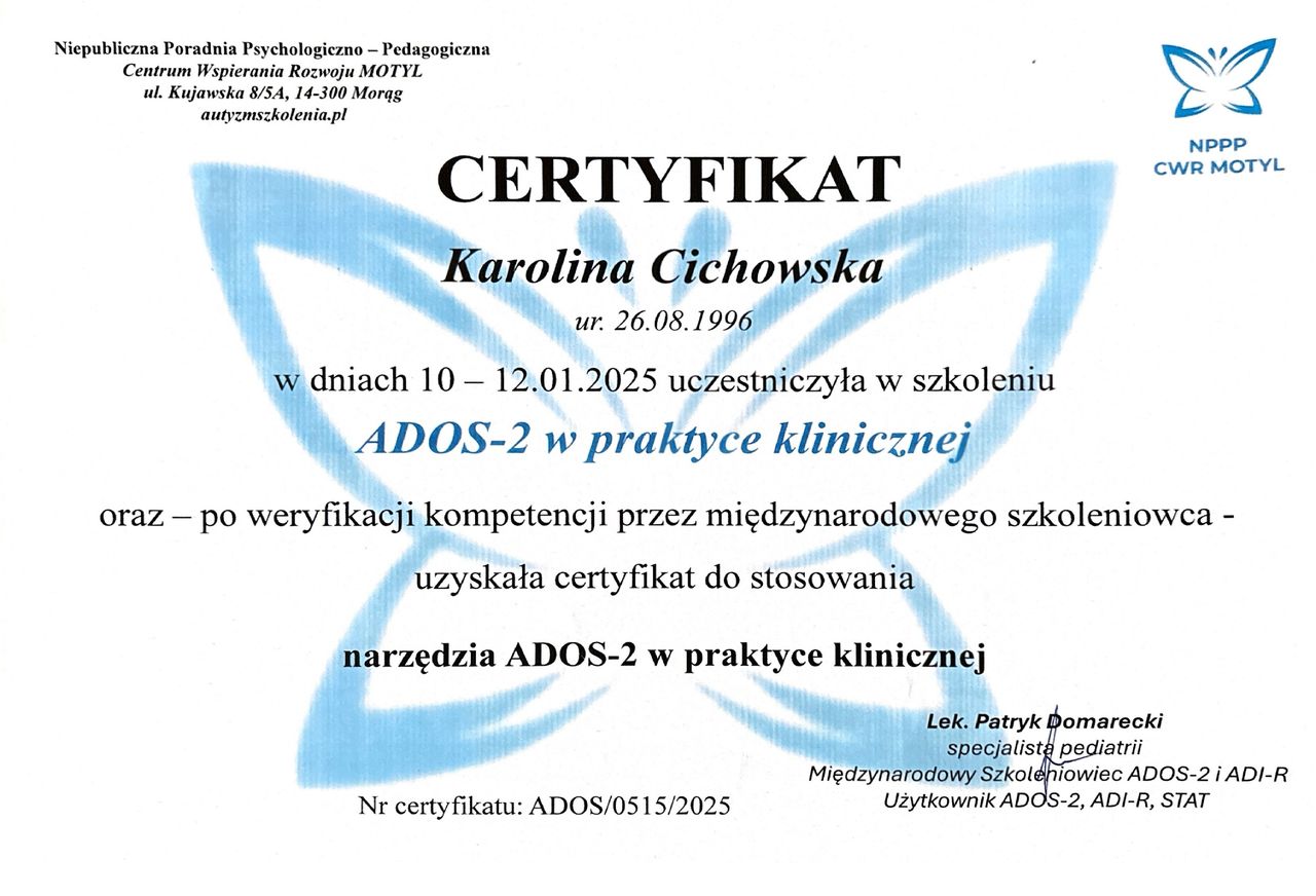 Pani Karolina to niezwykle kompetentny psycholog z solidną wiedzą specjalistyczną. Łączy profesjonalizm z ciepłem, empatią i dużym zrozumieniem. Trafnie rozpoznaje potrzeby dziecka oraz udziela cennych i skutecznych wskazówek rodzicom. Z pełnym przekonaniem polecam panią Karolinę !