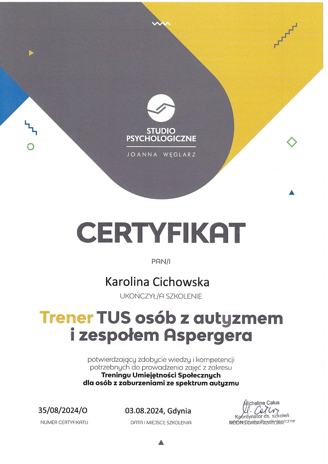 Trener Treningu Umiejętności Społecznych (TUS) osób z autyzmem i zespołem Aspergera - stopień I i II.
