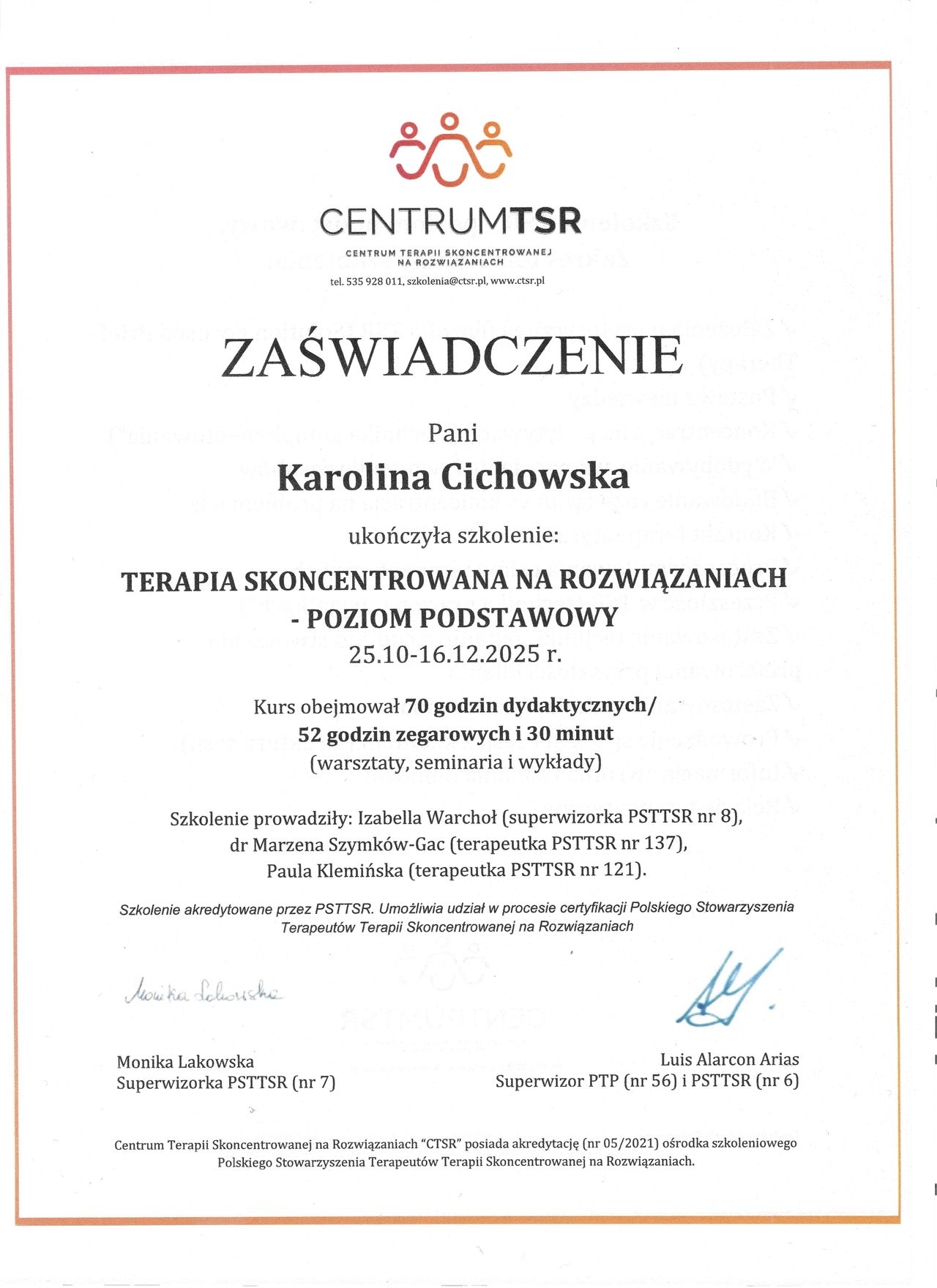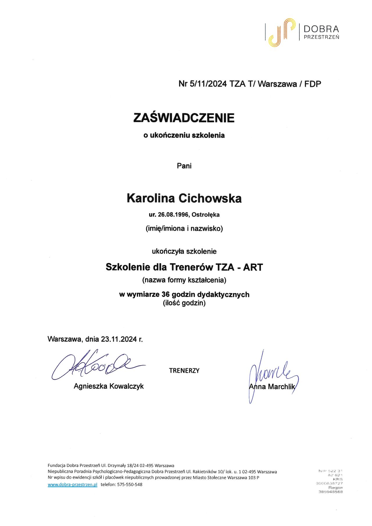 Stale rozwijam swoje kompetencje, uczestnicząc w licznych kursach i szkoleniach. Uzyskałam m.in. kwalifikacje i certyfikaty: