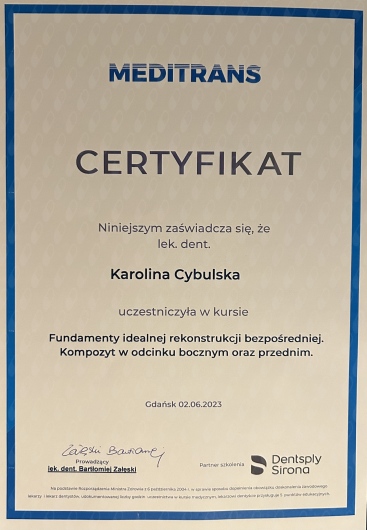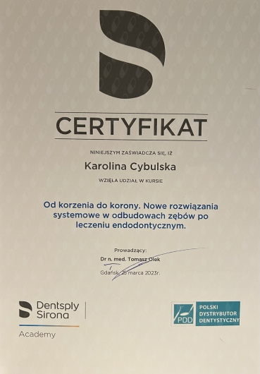 Jestem bardzo zadowolona z wizyt u doktor Cybulskiej. Miałam problem ze źle założonym wypełnieniem przez poprzedniego stomatologa, Pani Doktor z pełnym profesjonalizmem naprawiła, to co zostało zepsute. Zdecydowanie osoba, której można zaufać w kwestii swojego uzębienia. Polecam!