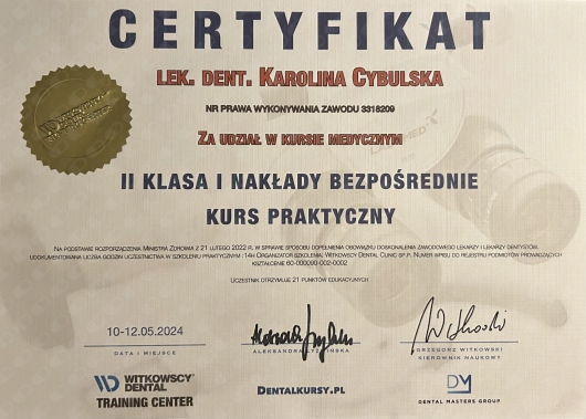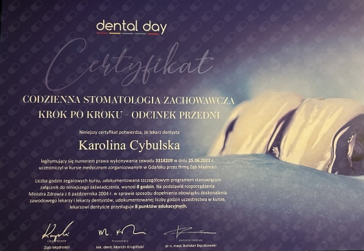 Wizyty u dentysty nigdy nie były dla mnie lękiem, jednak od kiedy chodzę do pani Karoliny stały się przyjemnością! Potrafi rozbawić leżącego na fotelu pacjenta, jest bardzo delikatna podczas pracy i szczegółowo wyjaśnia procedury. Po przeglądzie, zaplanowała leczenie ubytku oraz poprawę wypełnienia sprzed lat. Po kilku ustalonych wizytach leczenie zostało zakończone. Obecnie chodzę głównie na kontrole i przeglądy. Mogę szczerze polecić doktor Karolinę, zwłaszcza osobom które cenią sobie precyzyjną pracę i pozytywną atmosferę podczas wizyty.