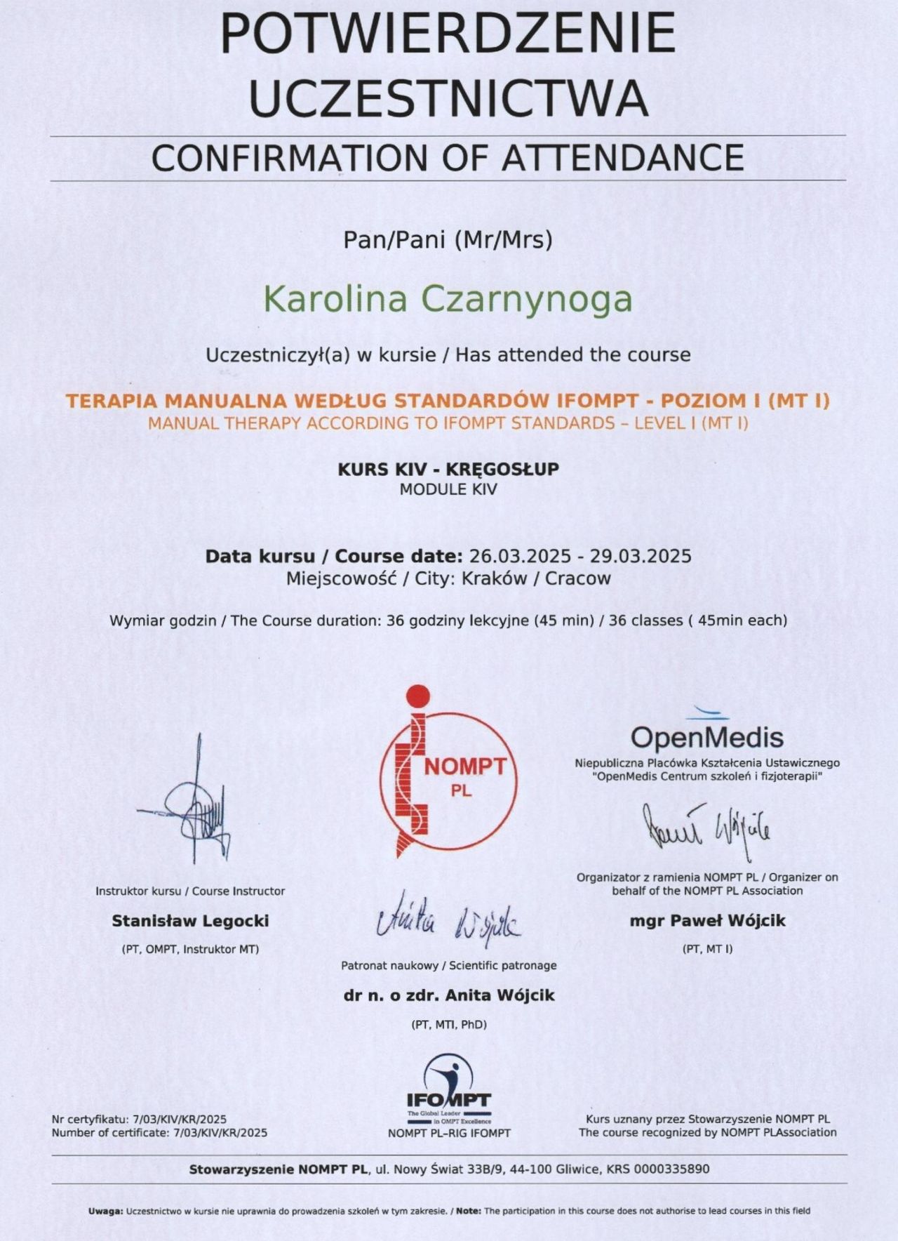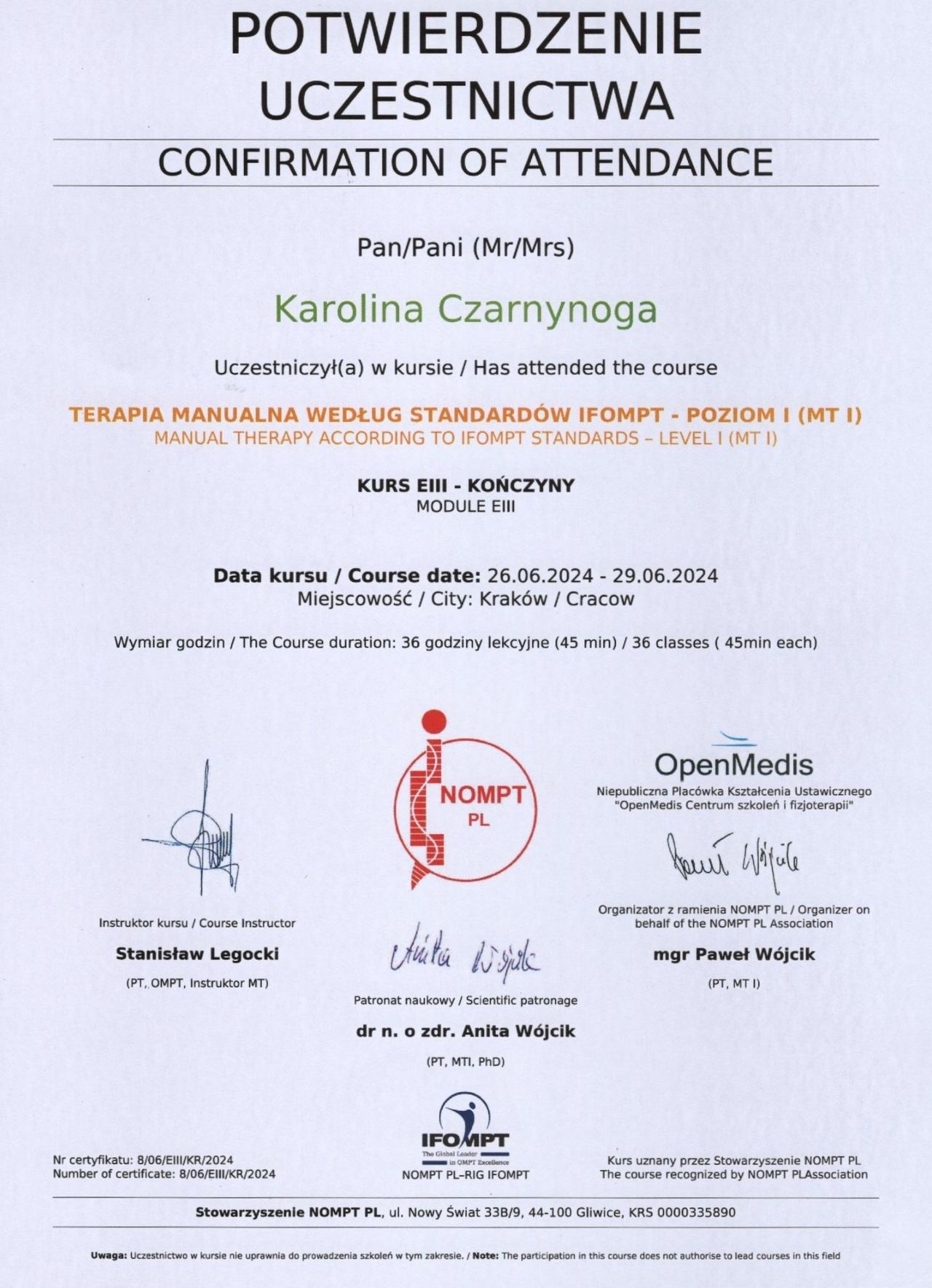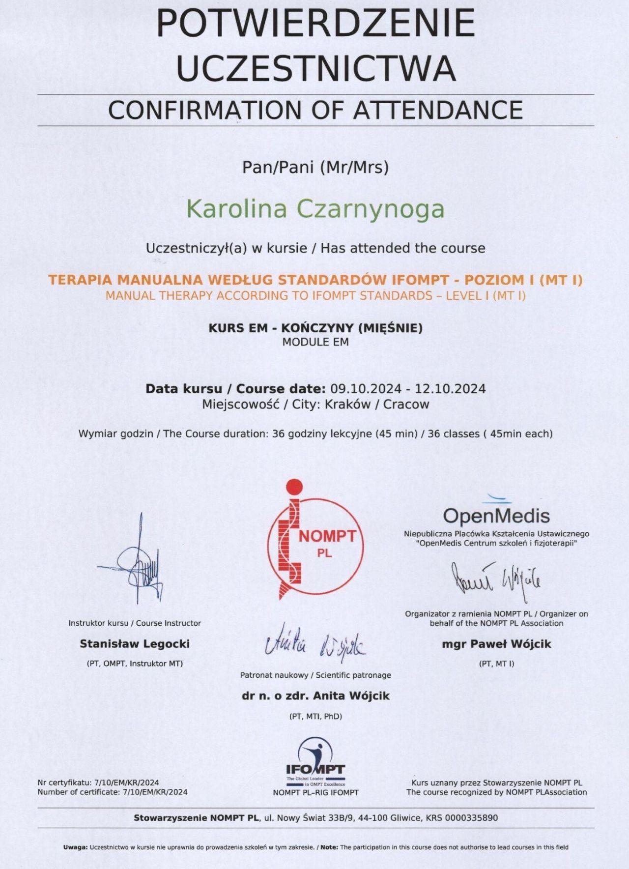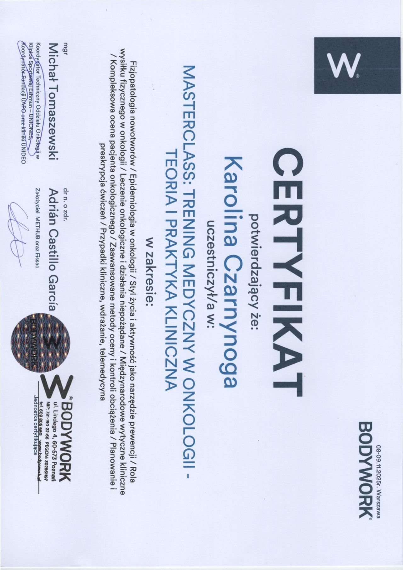 Serdecznie zapraszam osoby po zabiegach ortopedycznych oraz z przeciążeniami układu ruchu. Prowadzę treningi medyczne zarówno dla pacjentów w trakcie rehabilitacji, jak i osób, które chcą bezpiecznie rozpocząć trening siłowy. Szczególnym obszarem moich zainteresowań jest także onkologia ortopedyczna. Pracuję z indywidualnym podejściem, łącząc terapię manualną i ćwiczenia dostosowane do potrzeb pacjenta.