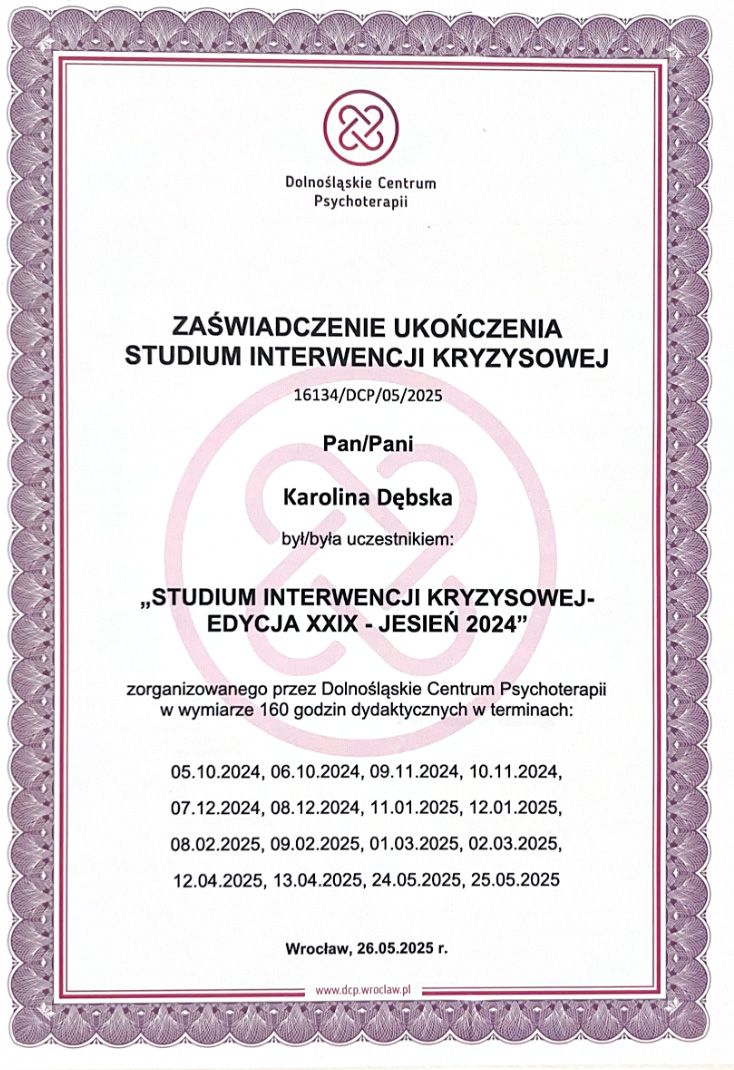 Jestem magistrem psychologii o specjalności klinicznej i zdrowia, absolwentką Uniwersytetu Wrocławskiego. Ukończyłam również studia podyplomowe z zakresu Interwencji Kryzysowej w Dolnośląskim Centrum Psychoterapii. Jestem terapeutką w nurcie psychodynamicznym, w trakcie szkolenia w Krakowskim Centrum Psychodynamicznym. Swoją wiedzę stale poszerzam biorąc udział w szkoleniach, warsztatach oraz webinarach, aby nieustannie się rozwijać oraz pracować zgodnie z aktualną wiedzą, na najwyższym poziomie.