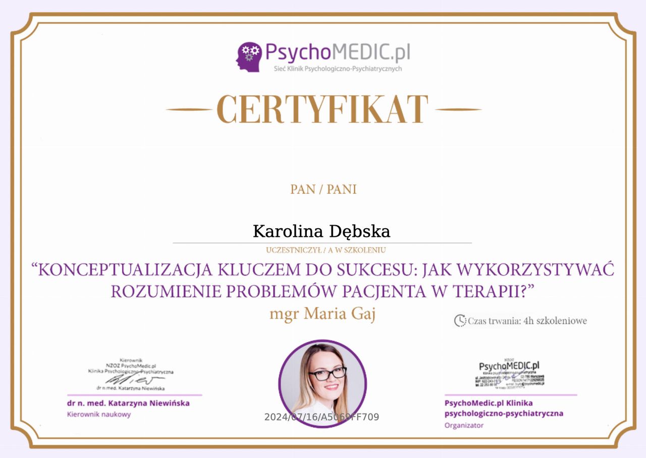 Pani Karolina jest batdzo zaangażowaną osobą, przez cały proces diagnozy ADHD i psychoedukacji mialem poczucie, ze jest otwarta na sugestie i pomocna. Szczegółowo wyjaśniła mi kwestie związane z procesem diagnozy a spotkania pomogły mi poradzić sobie z codziennymi problemami. Dziękuję
