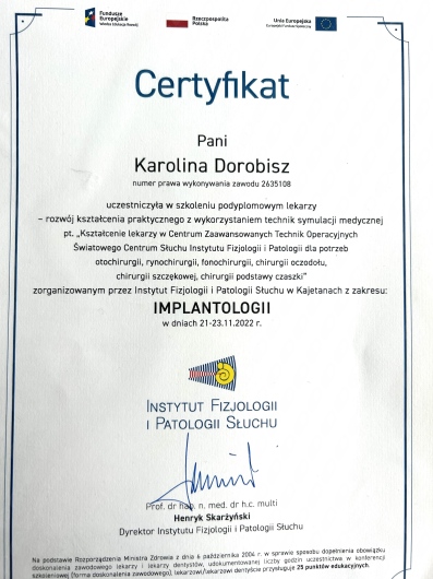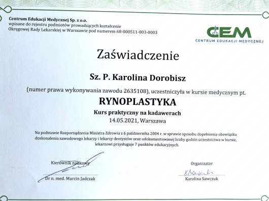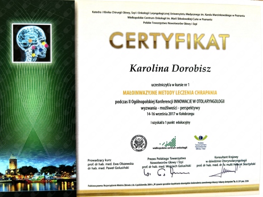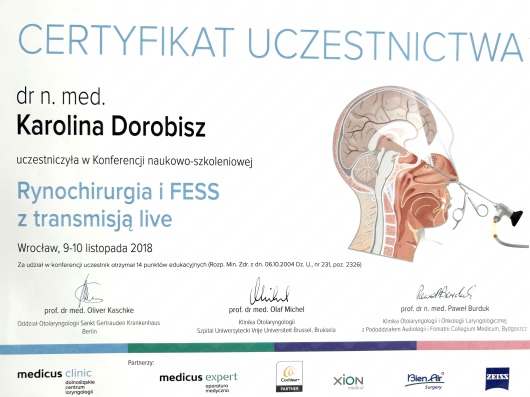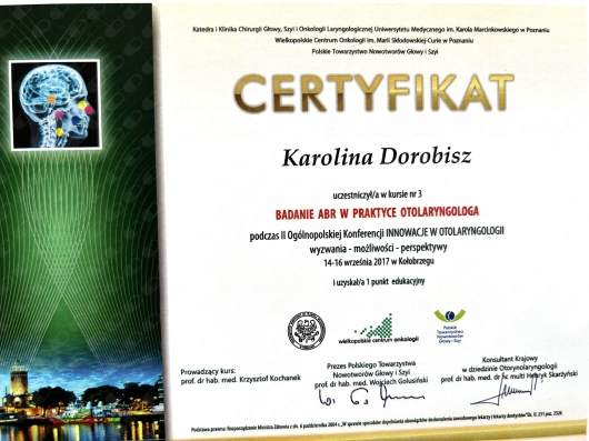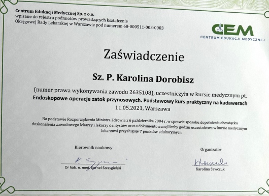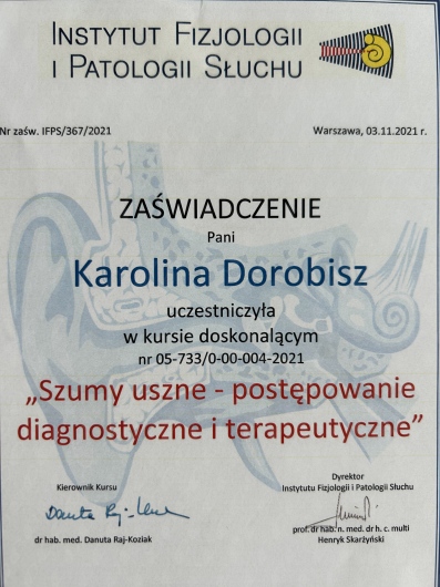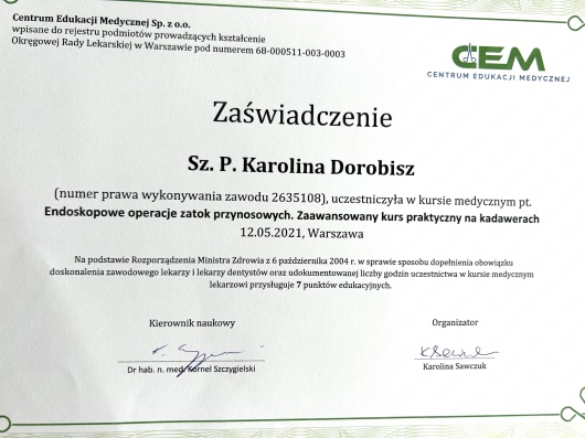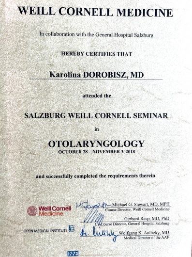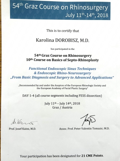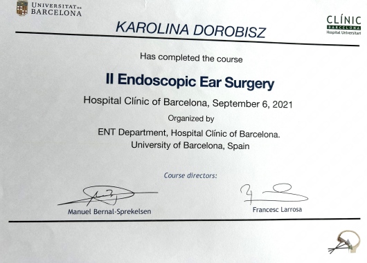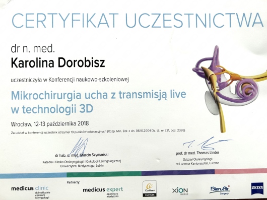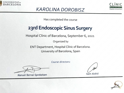 Uczestniczka licznych kursów doskonalących, między innymi z leczenia operacyjnego przewlekłego zapalenia zatok, mikrochirurgii ucha oraz krtani.