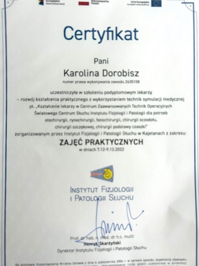 W roku 2016 obroniła pracę doktorską pod tytułem „Ocena narządu słuchu i układu równowagi u pacjentów ze zwężeniem tętnic dogłowowych w odcinkach zewnątrzczaszkowych”.