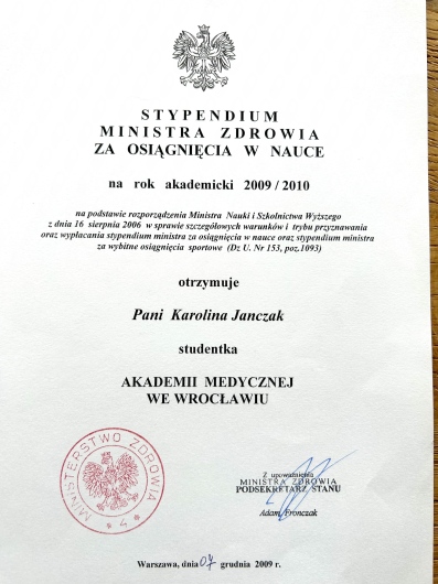 W roku akademickim 2009/2010 kształciła się w ramach programu Erasmus na Uniwersytecie Medycznym we Florencji.