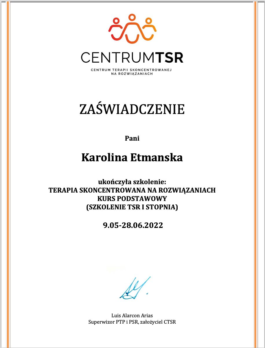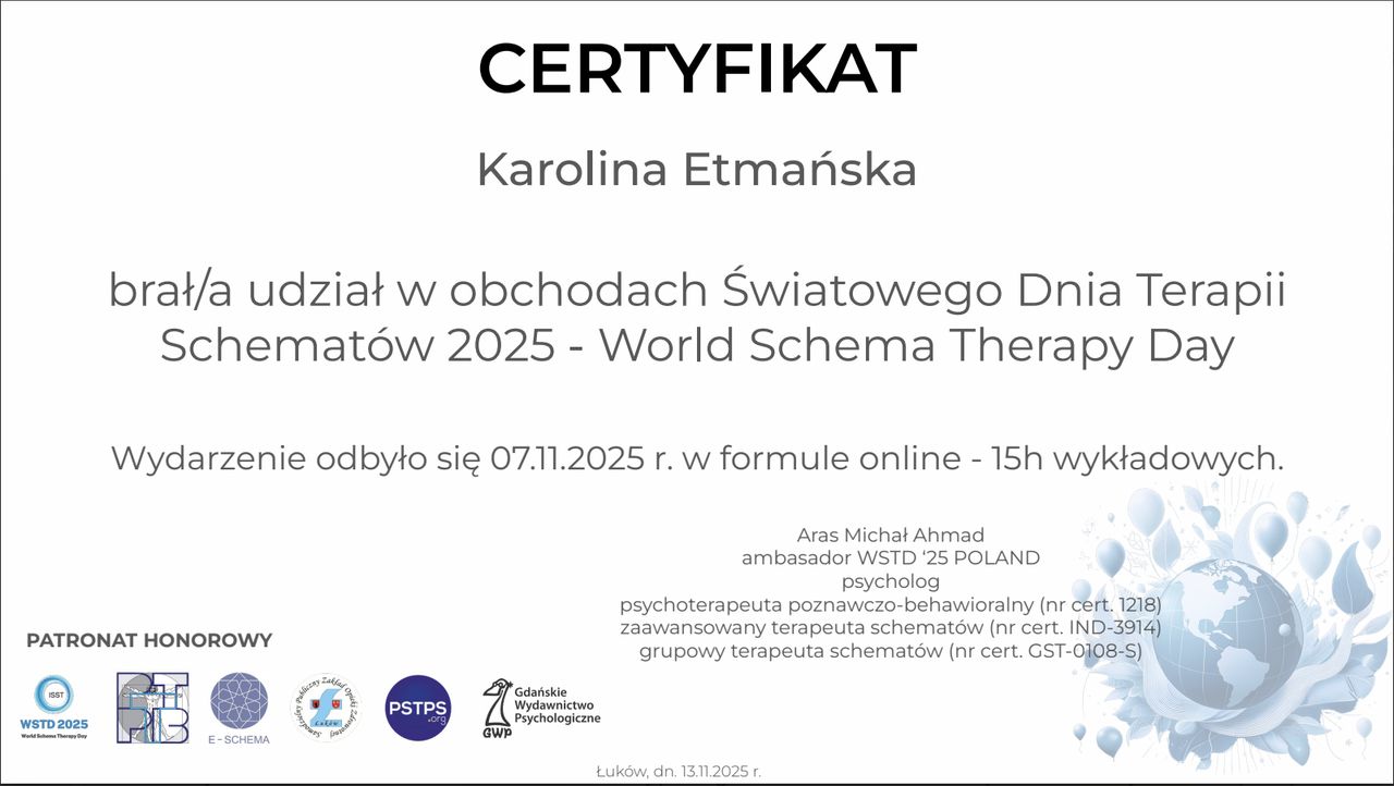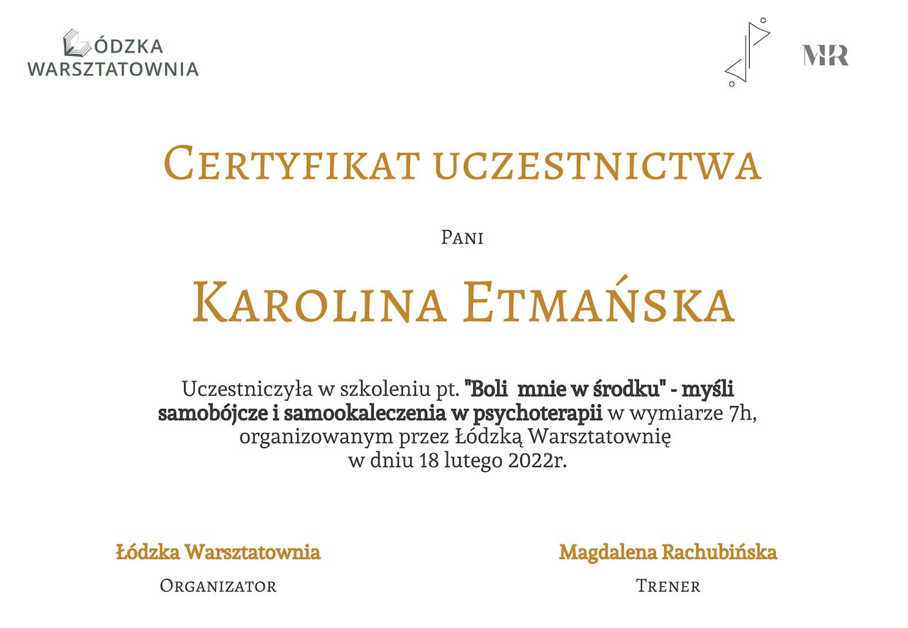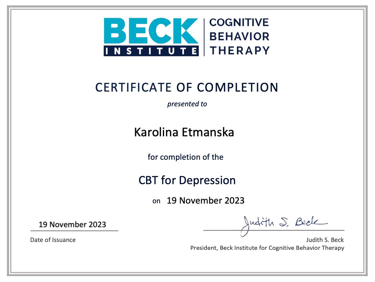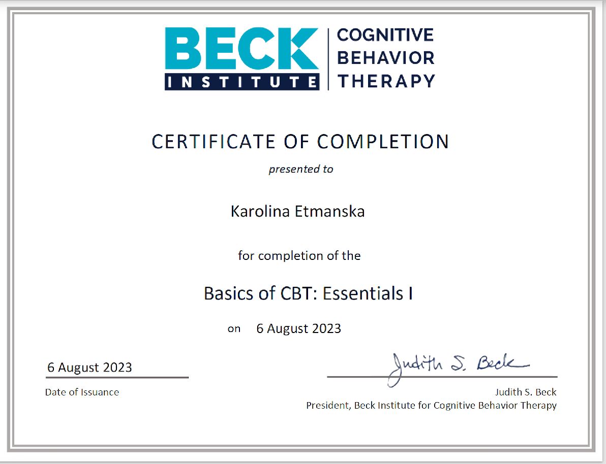 I graduated in psychology from Adam Mickiewicz University in Poznań and I am currently undergoing psychotherapeutic training in CBT at the SWPS School of Cognitive-Behavioral Therapy. At the same time, I am in the certification process at the American Beck Institute. I have also completed the first degree of solution-focused therapy at the CTSR in Warsaw. My work is being supervised.