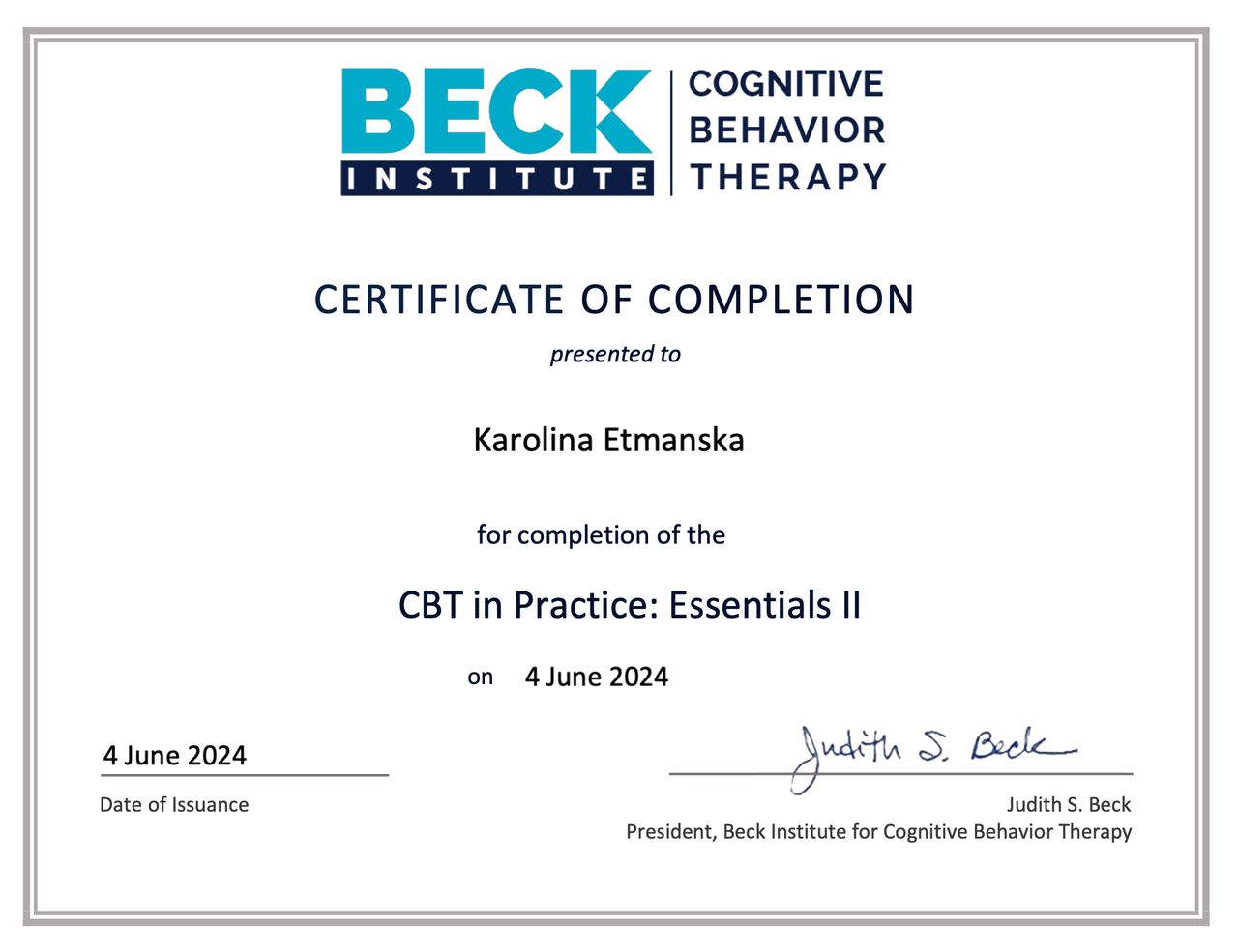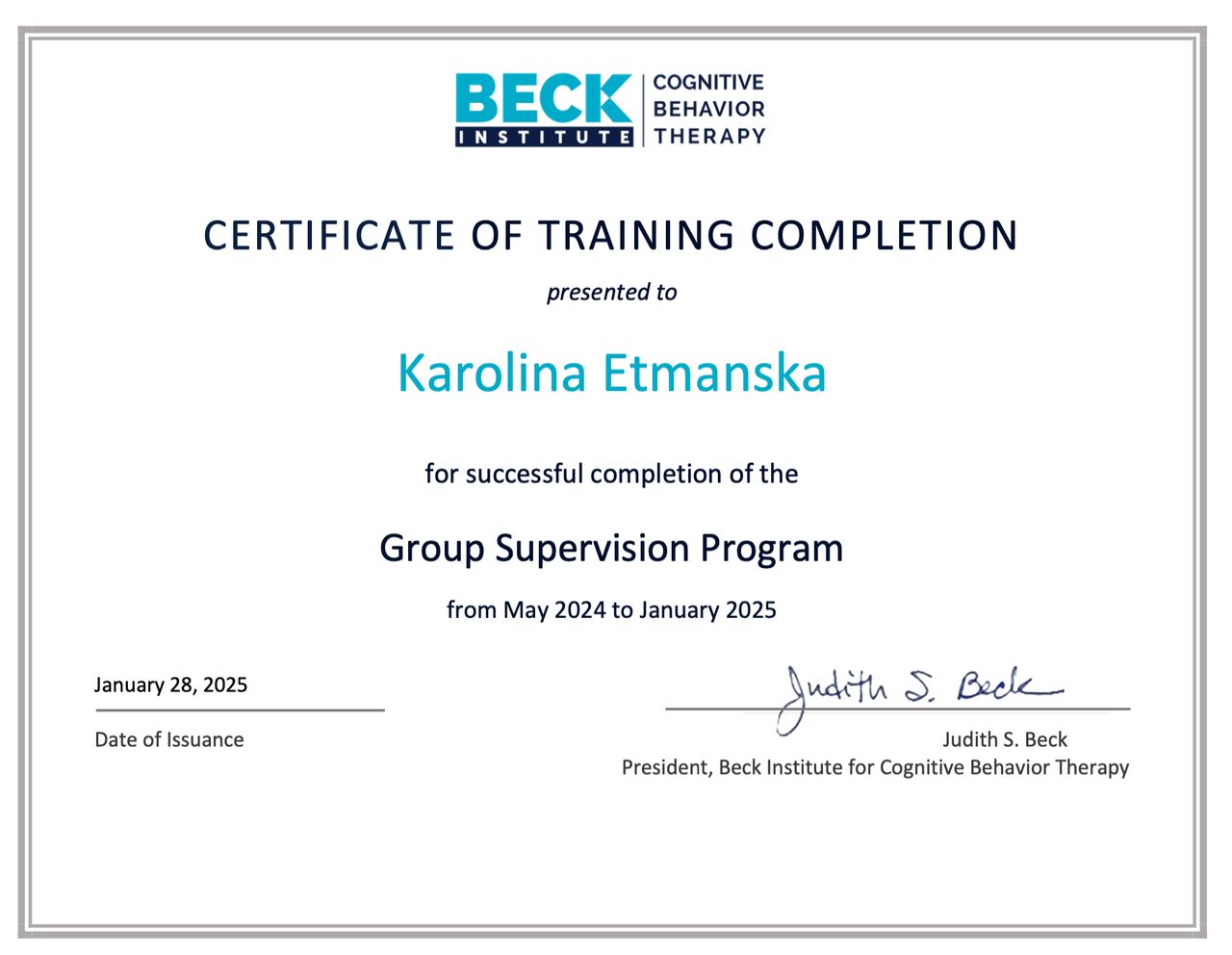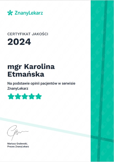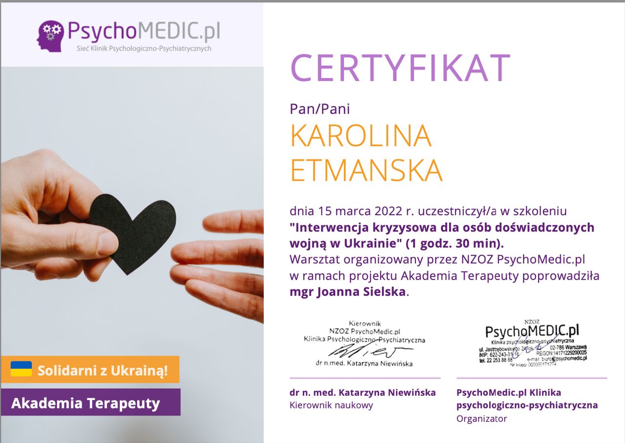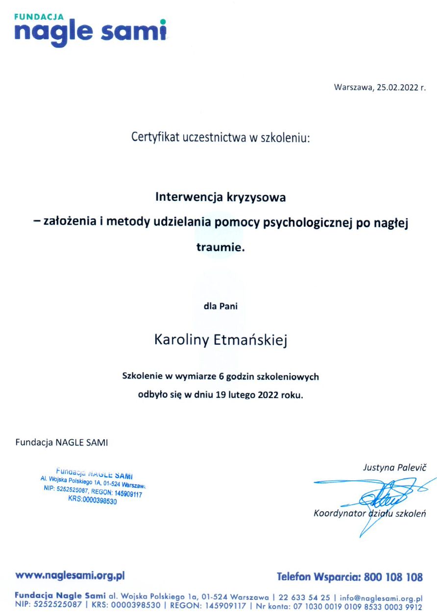 I graduated in psychology from Adam Mickiewicz University in Poznań and I am currently undergoing psychotherapeutic training in CBT at the SWPS School of Cognitive-Behavioral Therapy. At the same time, I am in the certification process at the American Beck Institute. I have also completed the first degree of solution-focused therapy at the CTSR in Warsaw. My work is being supervised.