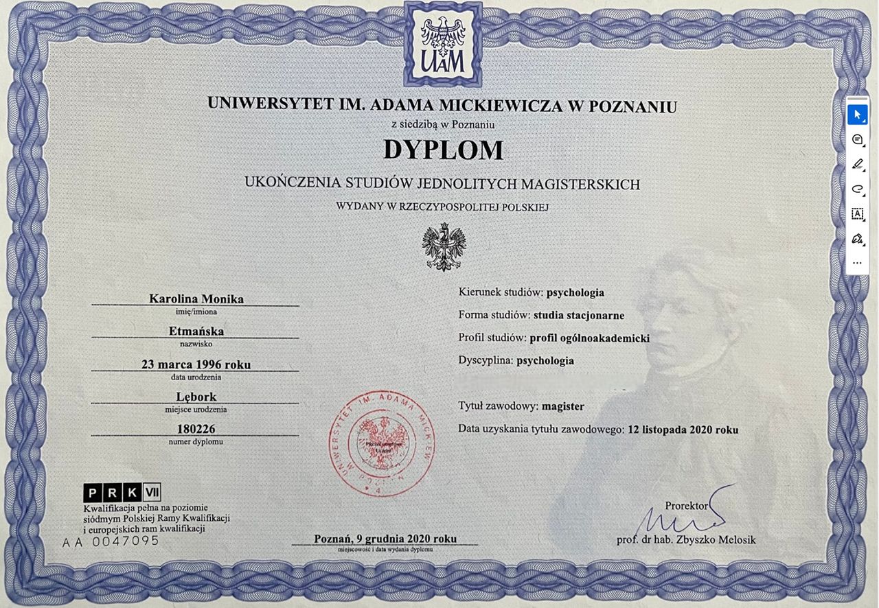 Ukończyłam studia magisterskie z psychologii na Uniwersytecie im. Adama Mickiewicza w Poznaniu, obecnie jestem w trakcie szkolenia psychoterapeutycznego w nurcie CBT w Szkole Psychoterapii Poznawczo-Behawioralnej SWPS w Poznaniu. Równolegle podlegam procesowi certyfikacji w Amerykańskim ośrodku Beck Institute. Ukończyłam również I stopień terapii skoncentrowanej na rozwiązaniach w CTSR w Warszawie. Moja praca podlega stałej superwizji.