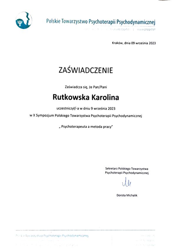 Jestem również członkiem Polskiego Towarzystwa Psychoterapii Psychodynamicznej.