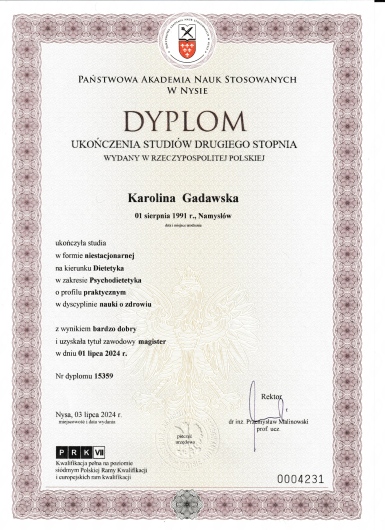 Jako dietetyk kliniczny i psychodietetyk, specjalizuję się w kompleksowej pomocy pacjentom z chorobami dietozależnymi, otyłością i innymi problemami. Podczas konsultacji nie tylko opracowujemy skuteczny plan żywieniowy, ale też pracujemy nad budowaniem zdrowej relacji z jedzeniem i własnym ciałem. W mojej pracy łączę wiedzę kliniczną z empatycznym wsparciem pscyhodietetycznym, co pozwala osiągać trwałe efekty bez restrykcyjnych diet.