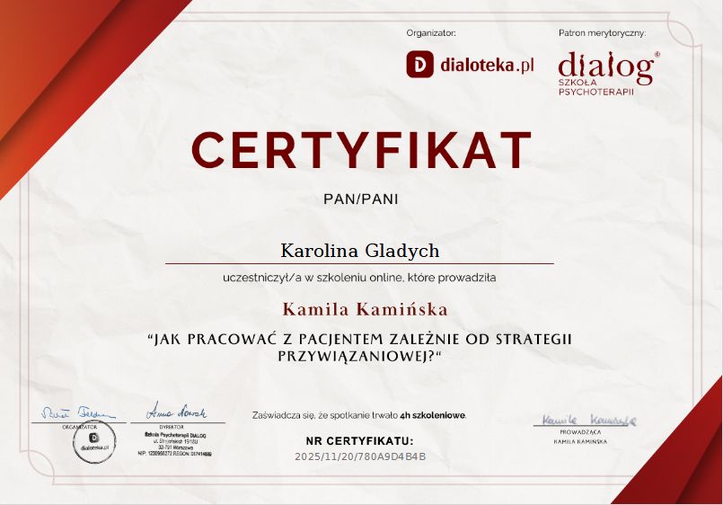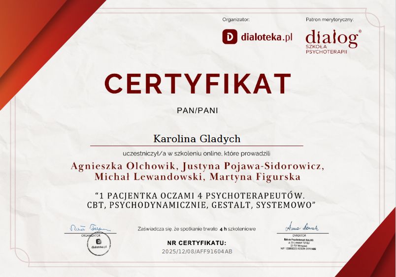 Czy Karolina Gładych przyjmuje online, bez konieczności pojawiania się w placówce?Tak, Karolina Gładych oferuje konsultacje online. Wybierz opcję „konsultacja online” przy umawianiu wizyty, a zobaczysz dostępne terminy.