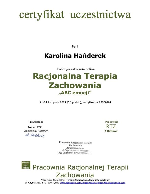 Jestem absolwentką psychologii Wydziału Nauk Społecznych Uniwersytetu Śląskiego w Katowicach ze specjalnościami: psychologia sądowa oraz psychologia kliniczna człowieka dorosłego. Aktualnie rozwijam swoje kompetencje w ramach Akredytowanego Kursu Psychoterapii w podejściu integratywnym systemowo-ericksonowskim w Katowickim Instytucie Psychoterapii.