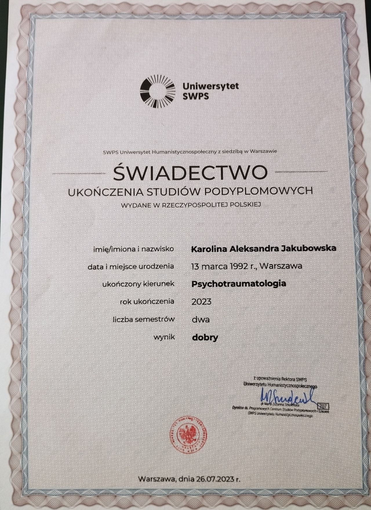 * Studia podyplomowe z psychotraumatologii na Uniwersytecie SWPS,