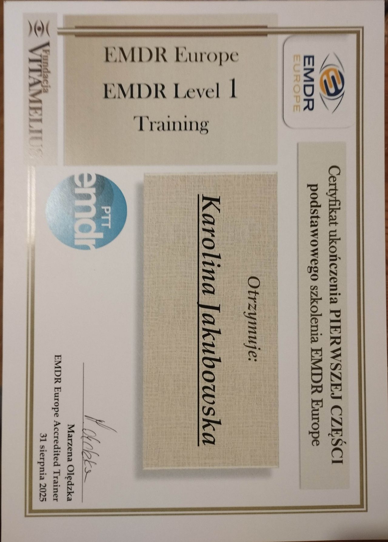 • Szkolenie EMDR Europe (poziom I), rekomendowane przez Polskie Towarzystwo EMDR