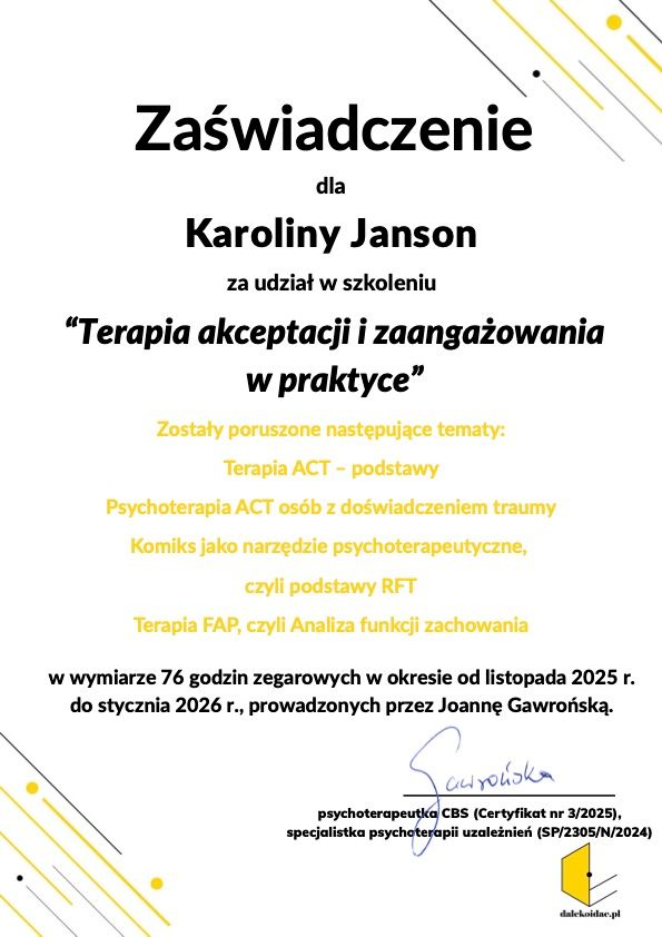 Dbam o stały rozwój zawodowy, regularnie korzystając z superwizji grupowej i indywidualnej u Joanny Gawrońskiej oraz poszerzając wiedzę poprzez szkolenia i literaturę specjalistyczną.