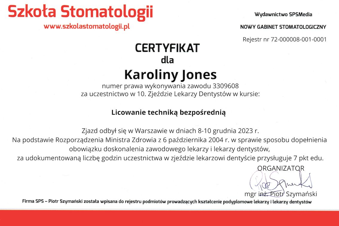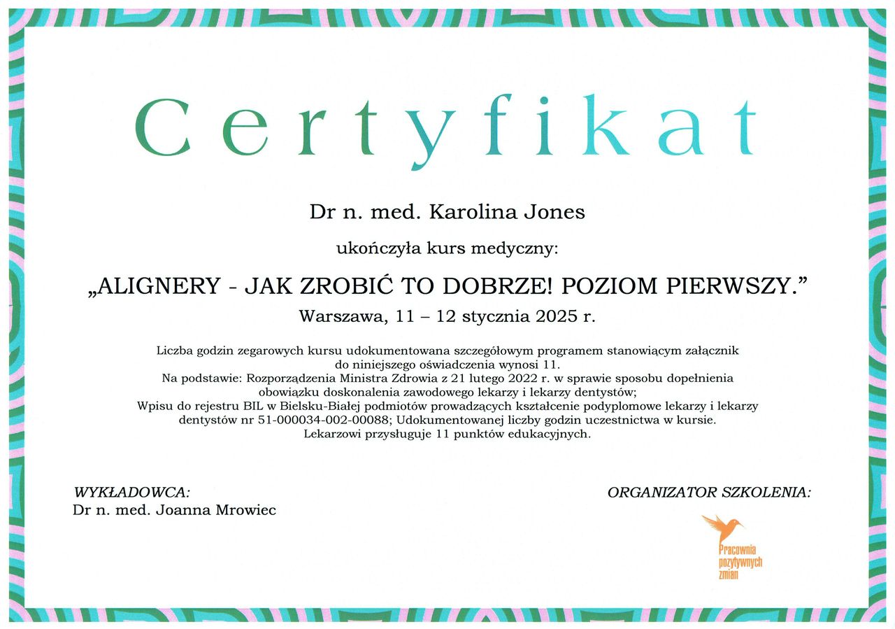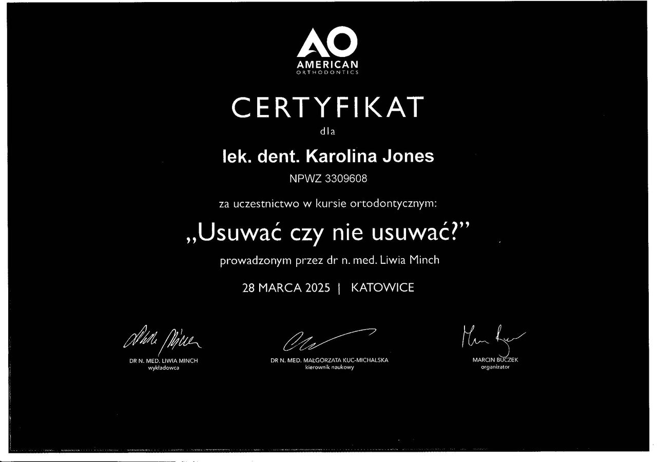 Pani Doktor Jones w sposób kompleksowy i staranny podeszła do mojego przypadku. Cierpliwie i zrozumiale wyjaśniła na czym polega problem i jakie leczenie będzie najlepsze. Cenie sobie sumienność, punktualność dlatego polecam dr Jones.