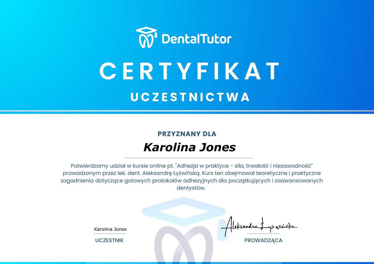 Na co dzień zajmuję się leczeniem zachowawczym, stomatologią estetyczną oraz leczeniem ortodontycznym. W pracy stawiam na cierpliwość i empatię, dbając o to, by pacjenci czuli się komfortowo podczas leczenia. Nieustannie podnoszę swoje kwalifikacje, uczestnicząc w szkoleniach i kursach.