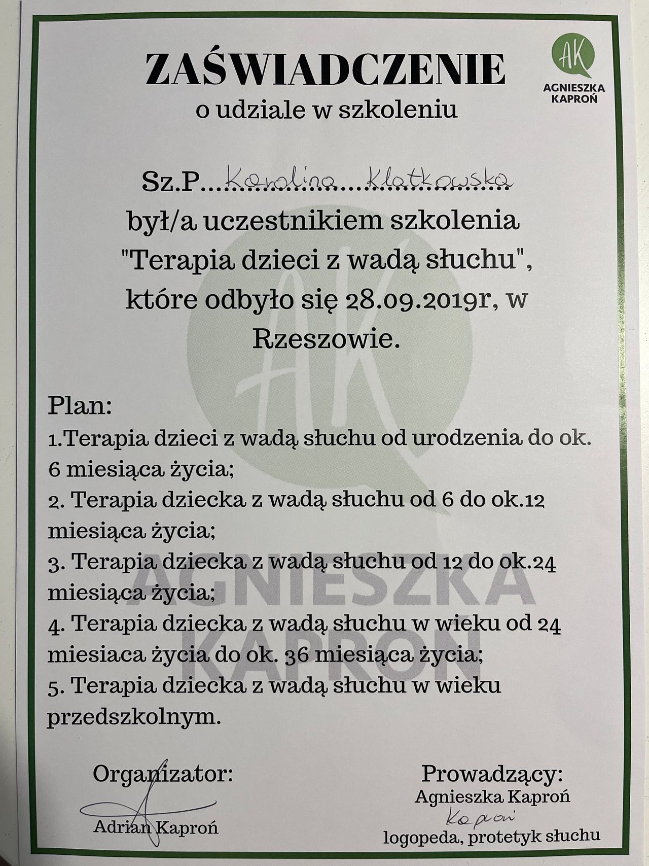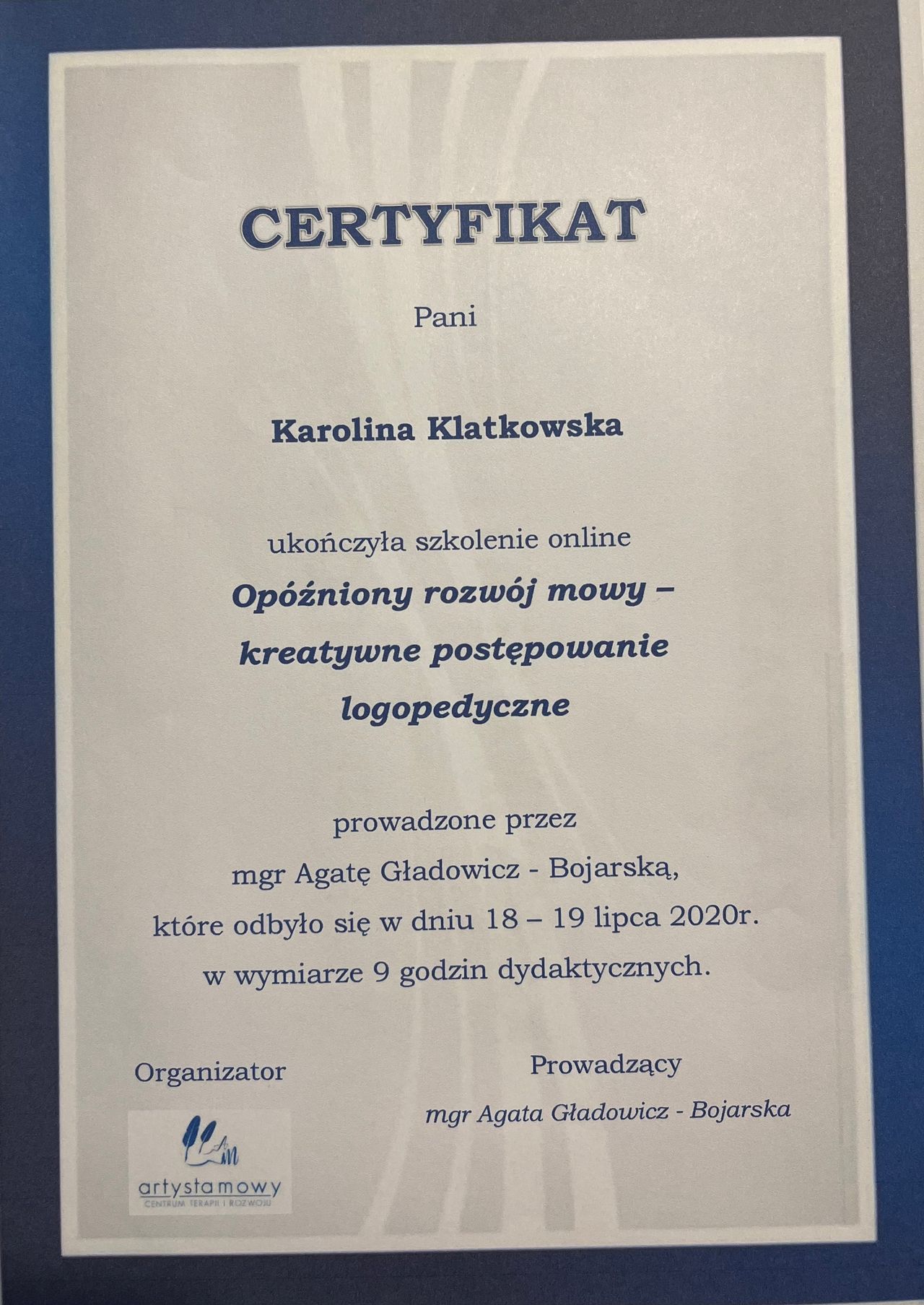 Pani Karolina jest pełna empatii i klarownie wszystko tłumaczy. Po przeprowadzonej diagnozie zdecydowałam się na rozpoczęcie terapii córki właśnie u Pani Klatkowskiej. Już po pierwszym spotkaniu czułam, że Pani Karolina jest specjalistką.