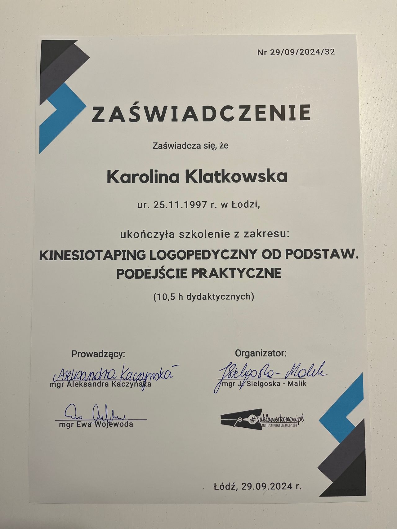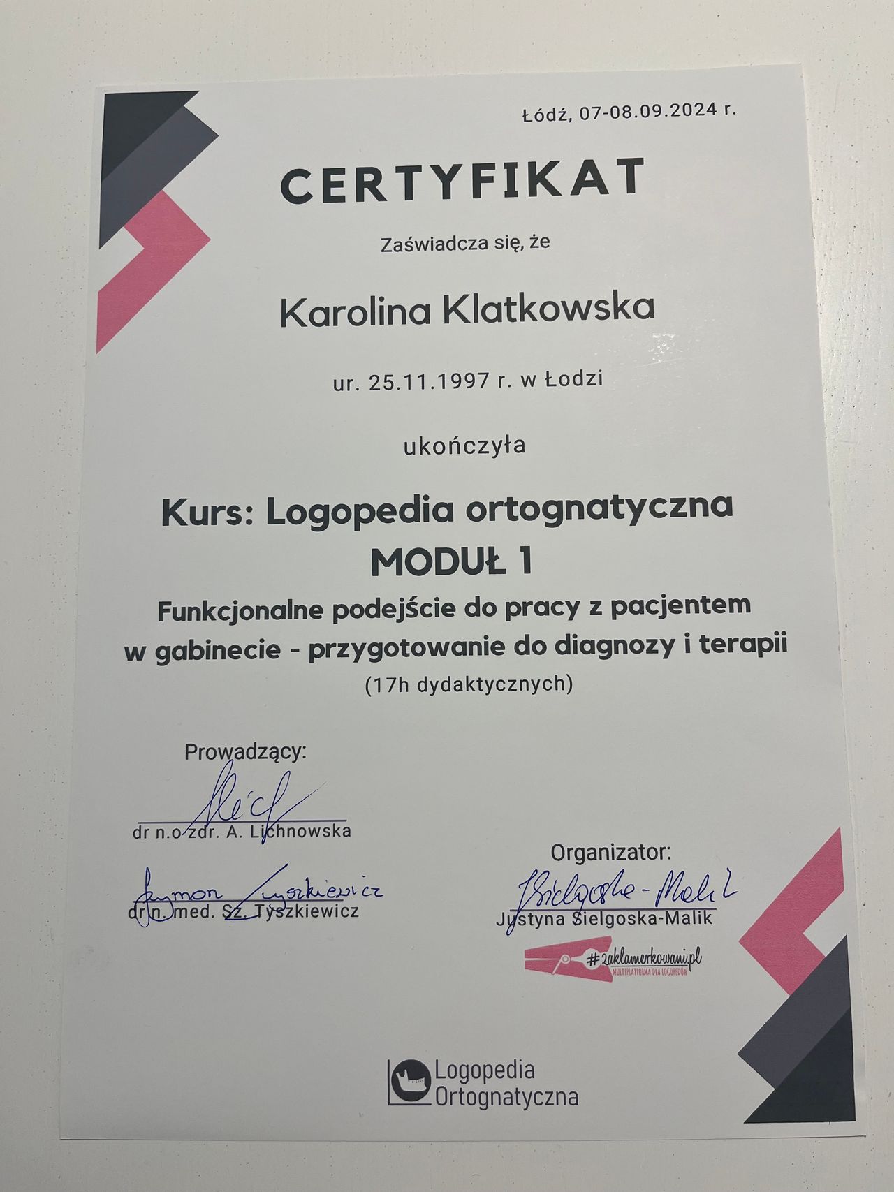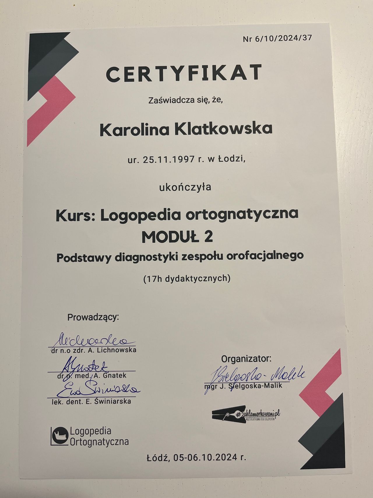 Nazywam się Karolina Klatkowska i jestem związana z siecią GABINETÓW LOGOPEDYCZNO-TERAPEUTYCZNYCH "KLAMERKA". Na co dzień przyjmuję pacjentów w gabinetach mieszczących się przy ul. Zagłębie 4 i na ul. Gdańskiej 145 w Łodzi. Jestem: neurologopedą, terapeutą miofunkcjonalnym oraz terapeutą SI. Najważniejsza jest dla mnie empatia i indywidualne podejście do każdego pacjenta. Specjalizuję się w pracy z noworodkami i niemowlakami (do 4 miesiąca życia), pracą z dziećmi zarówno w wieku przedszkolnym, jak i szkolnym.
