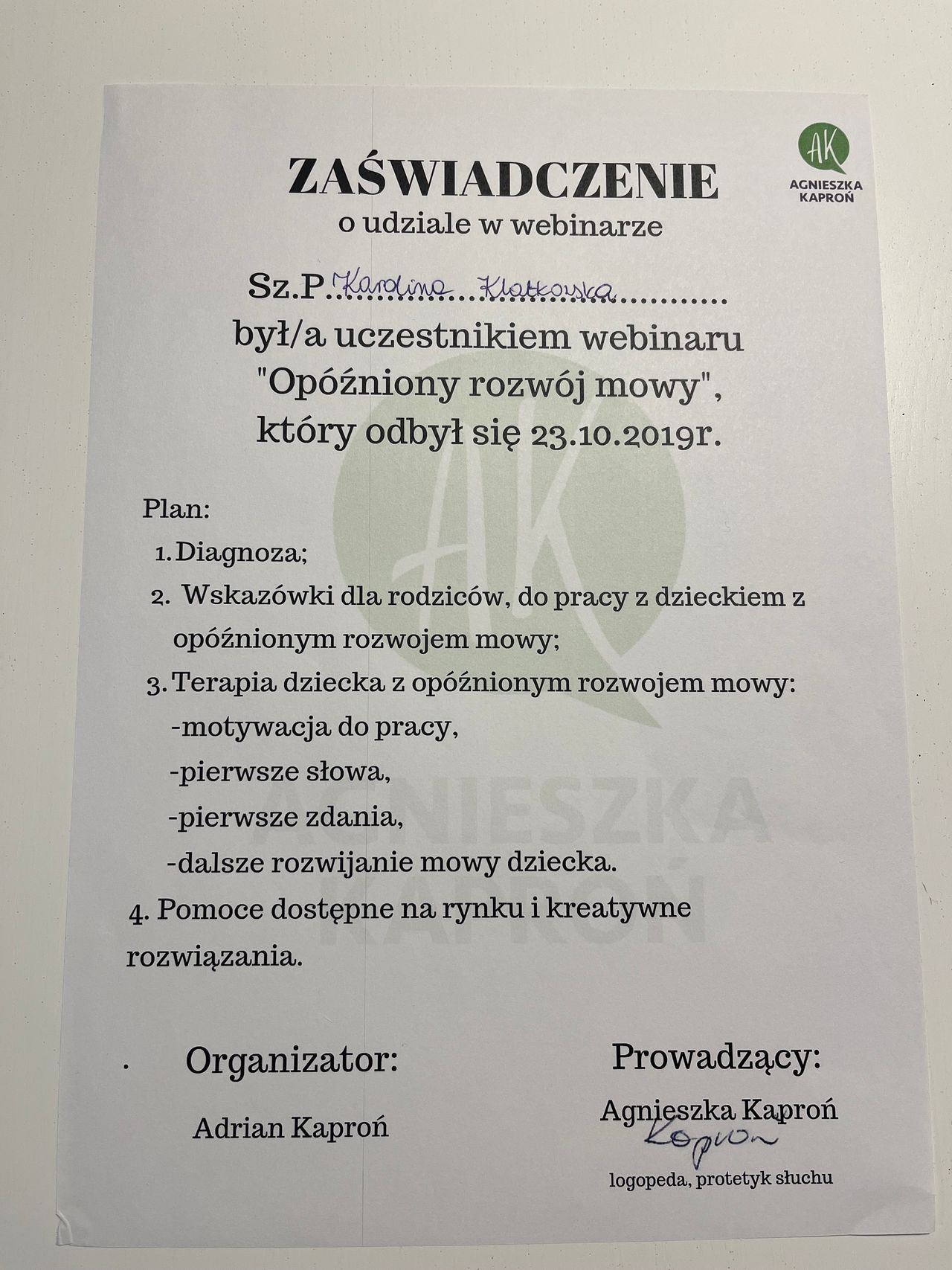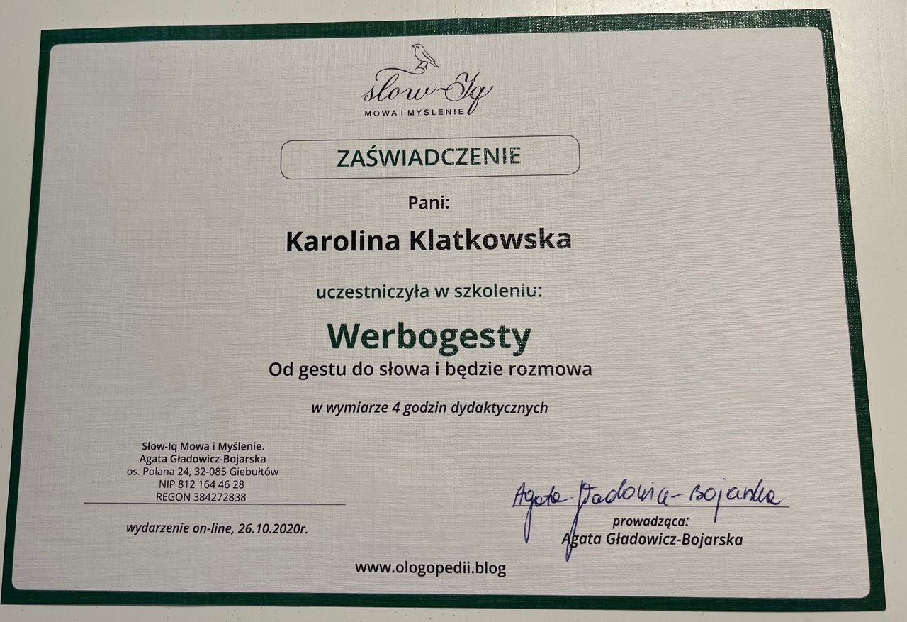 Na zajęcie logopedyczne do Pani Karoliny Klatkowskiej uczęszczała dwójka naszych dzieci.