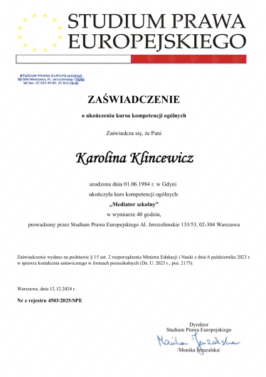 Ukończyłam również studia podyplomowe z Podstaw psychologii rodzinnej i mediacji rodzinnych.