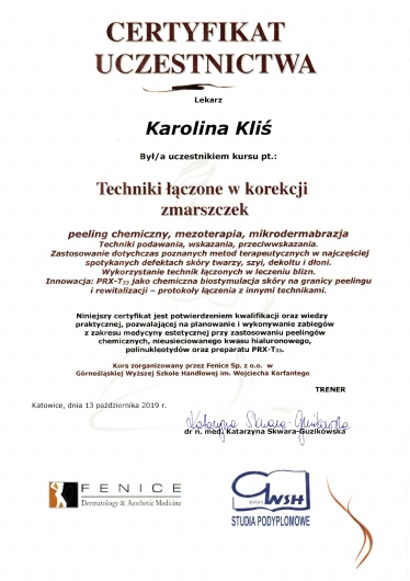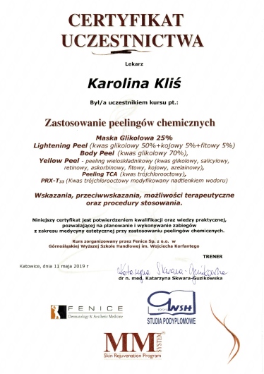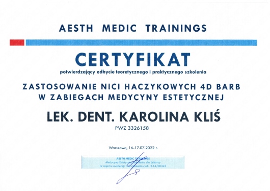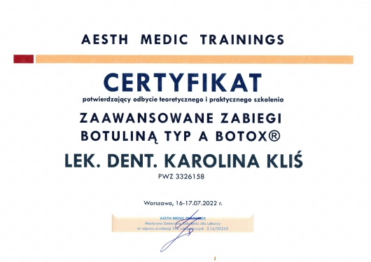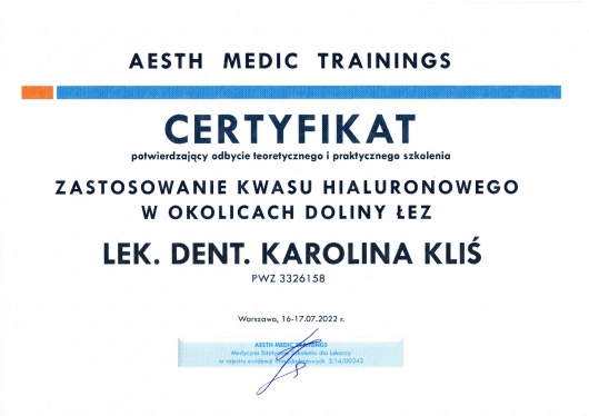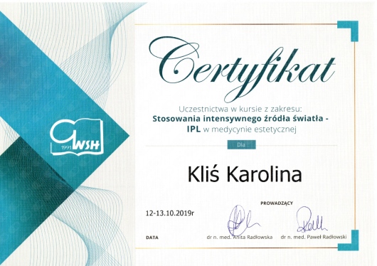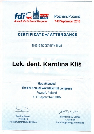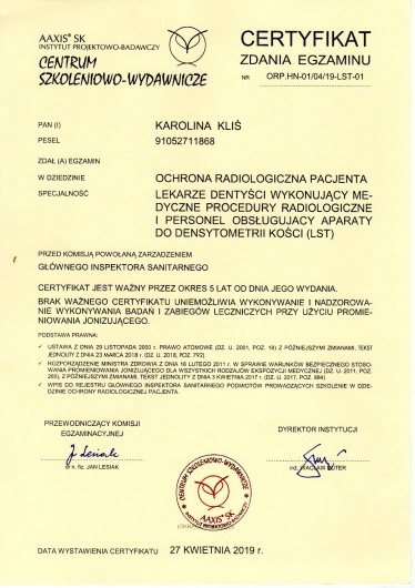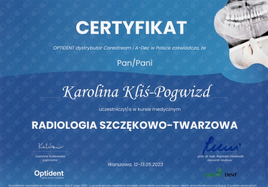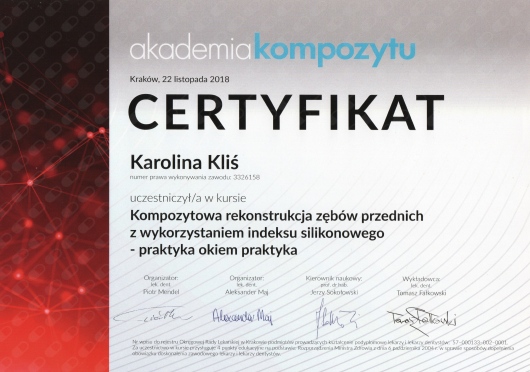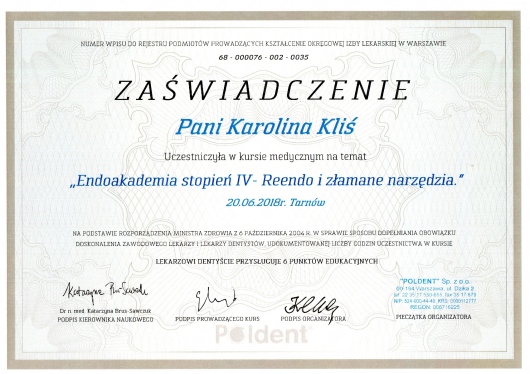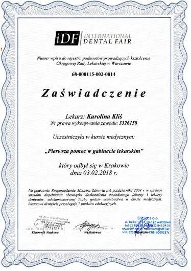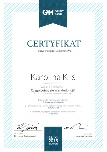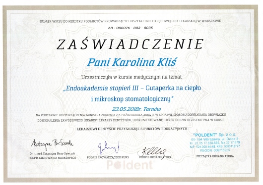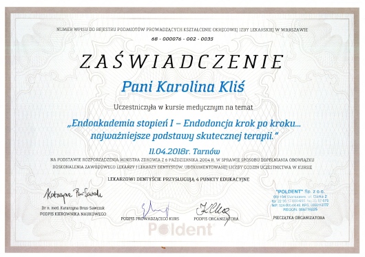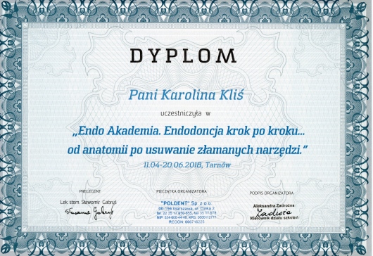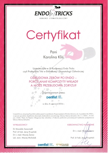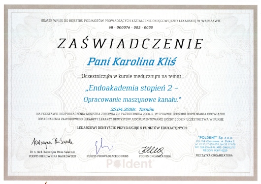 Staram się stale doskonalić swoją wiedzę i umiejętości. Od lat uczestniczę w kursach z zakresu stomatologii zachowawczej, protetyki, endodoncji, ortodoncji i medycyny estetycznej.