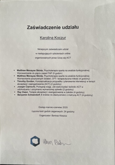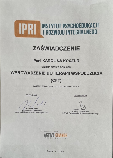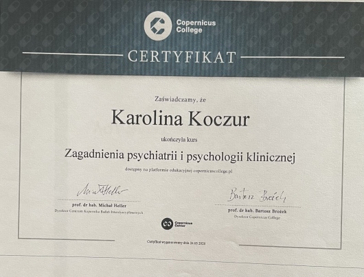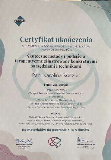 Polecam każdemu terapie u Pani Karoliny! Jest niezwykle empatyczna i profesjonalna, nigdy nie ocenia, naprowadza na rozwiązania. Terapia z Panią Karoliną uwolniła mnie od stanów lękowych, pomogła mi w codziennych problemach i zmieniła spojrzenie na wiele spraw. To wszystko w takiej atmosferze, że aż przykro, że to już powoli koniec :)