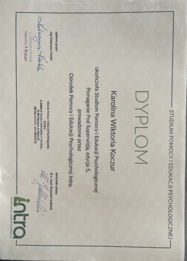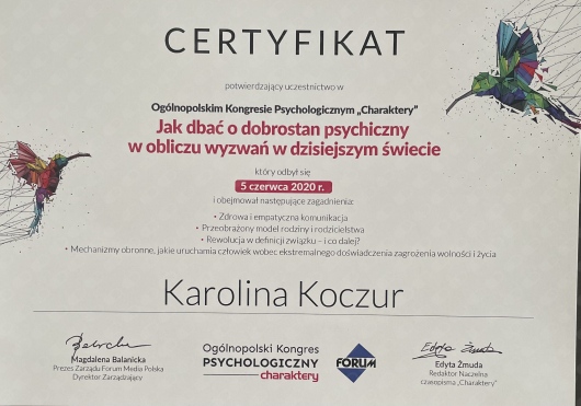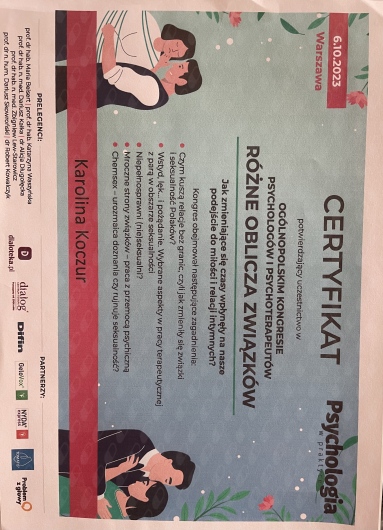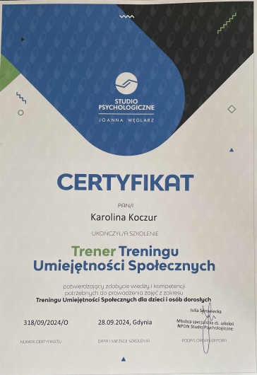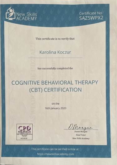 Polecam z całego serca Panią Karolinę. Jest kompetentną Panią psycholog, przy której każdy poczuje się swobodnie. Stwarza atmosferę pełna zrozumienia i bezpieczeństwa, która pozwala się otworzyć na rozmowę. Jest profesjonalna i ogromnie pomaga w pracy nad sobą i zrozumieniu własnych emocji oraz potrzeb.