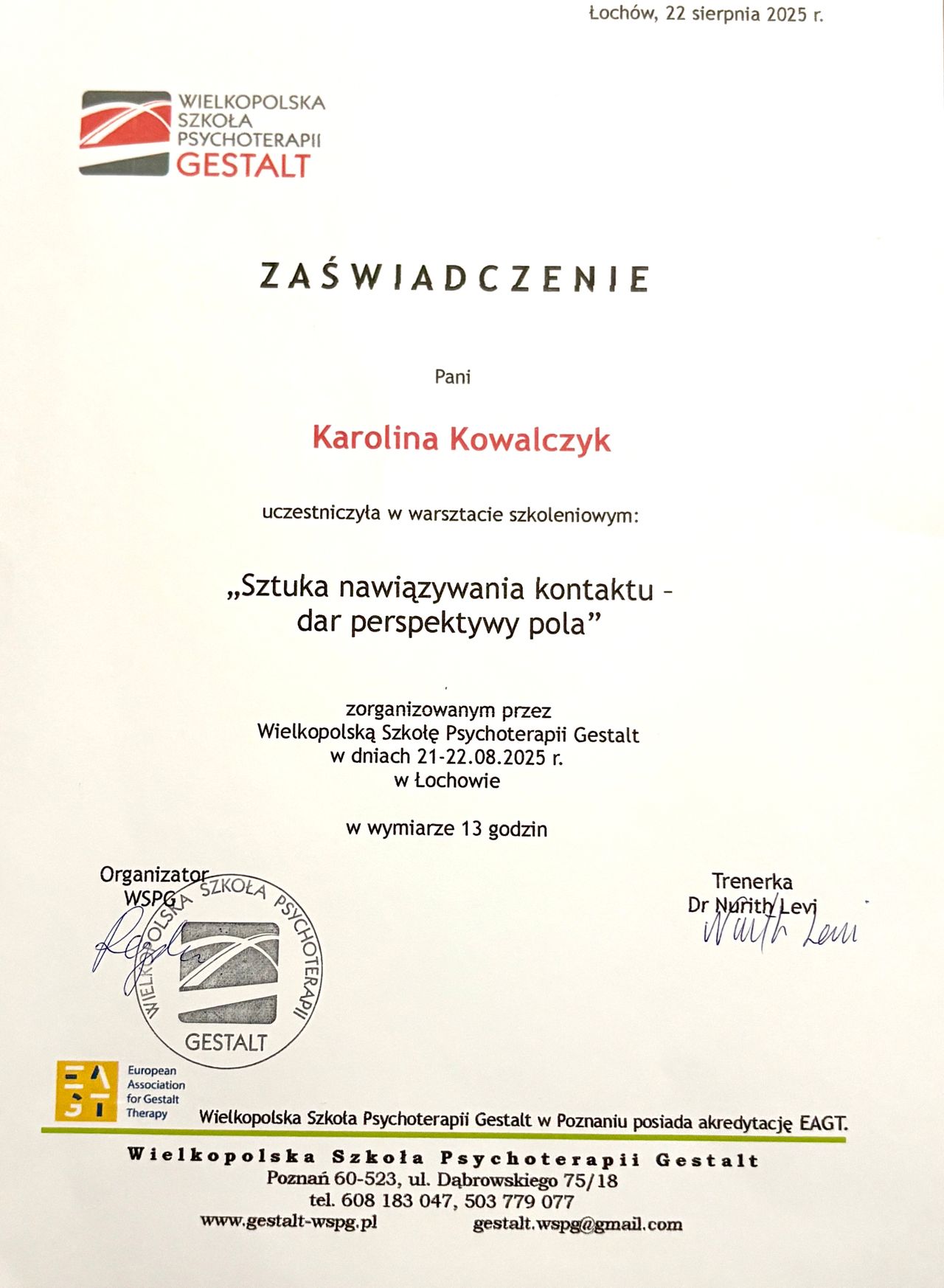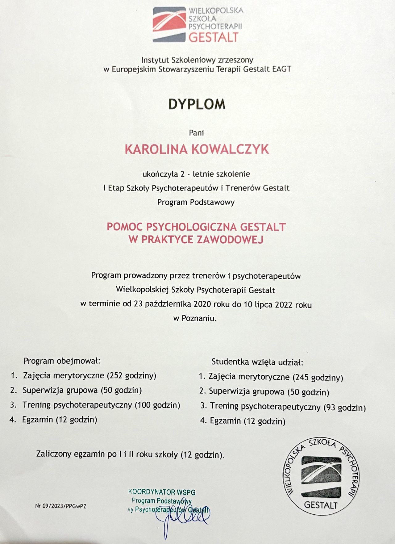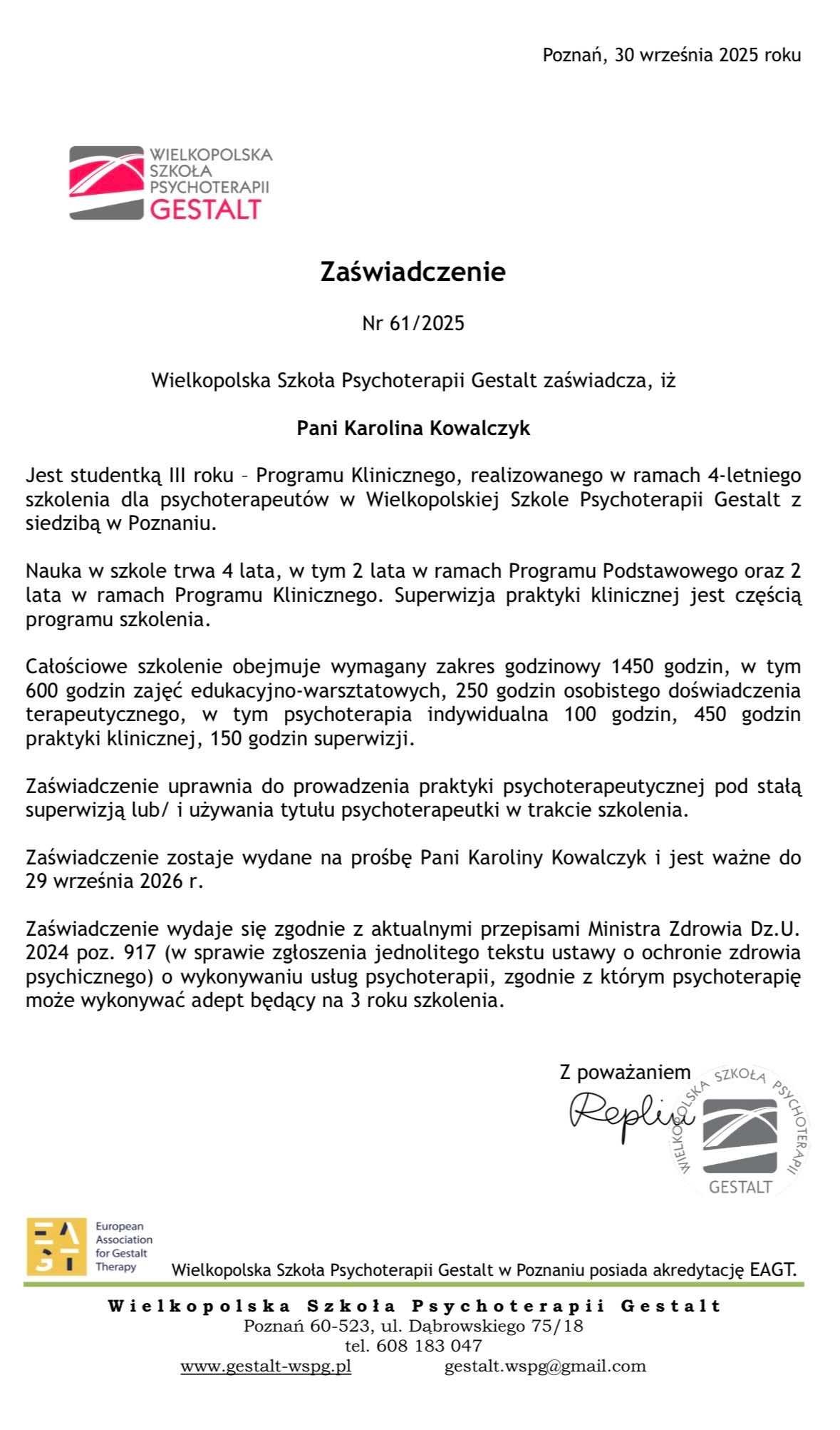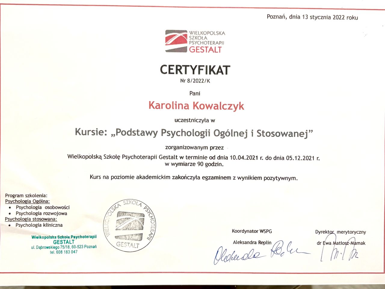 Jestem w trakcie programu klinicznego 4-letnich studiów akredytowanej przez EAGT Wielkopolskiej Szkoły Psychoterapii Gestalt. Praktykę rozpoczęłam w 2021 roku w Centrum Psychoterapii Help w Warszawie i we własnym gabinecie.