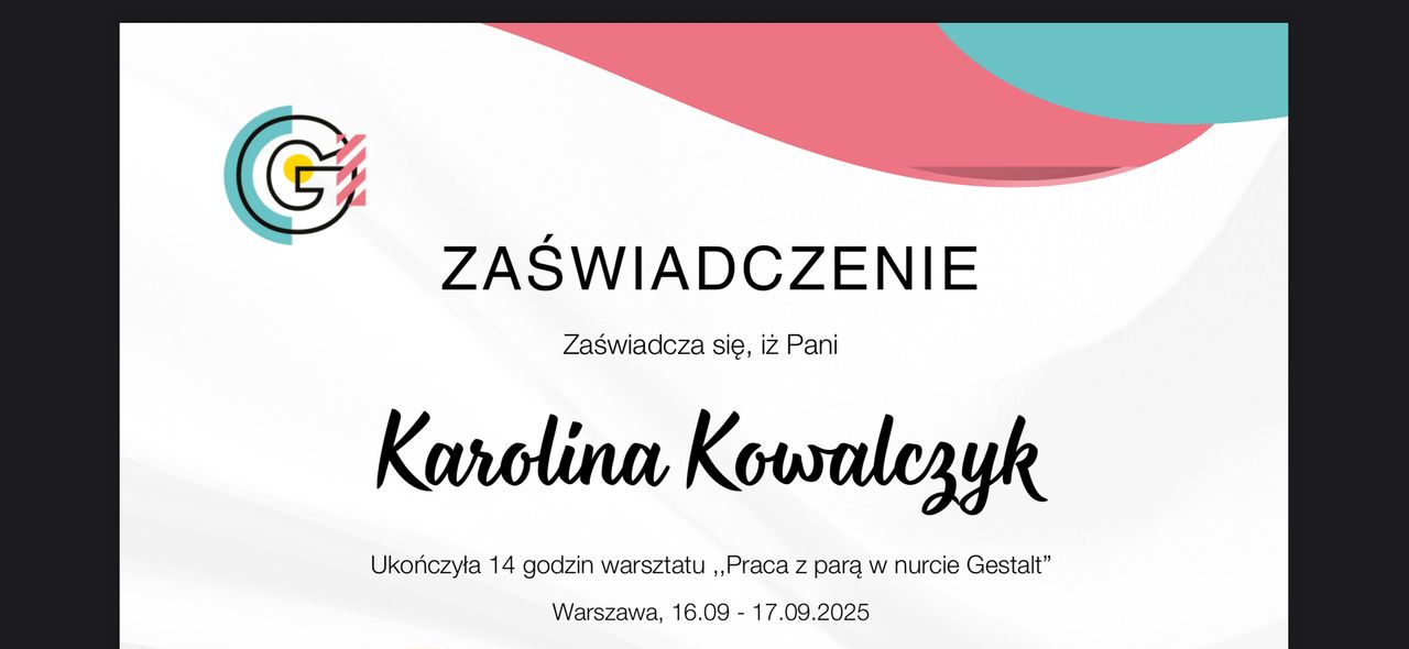Pani Karolina jest niezwykle empatyczną i uważną terapeutką. Od pierwszej wizyty tworzy ciepłą, otwartą i w pełni bezpieczną przestrzeń, w której można poruszyć nawet najtrudniejsze tematy. Dzięki jej spokojowi, mądrości i umiejętności uważnego słuchania czuję się naprawdę rozumiana i zaopiekowana. Każde spotkanie wnosi we mnie więcej klarowności i spokoju. Szczerze polecam pracę z Panią Karoliną każdemu, kto szuka profesjonalnego, delikatnego i wspierającego podejścia w terapii.