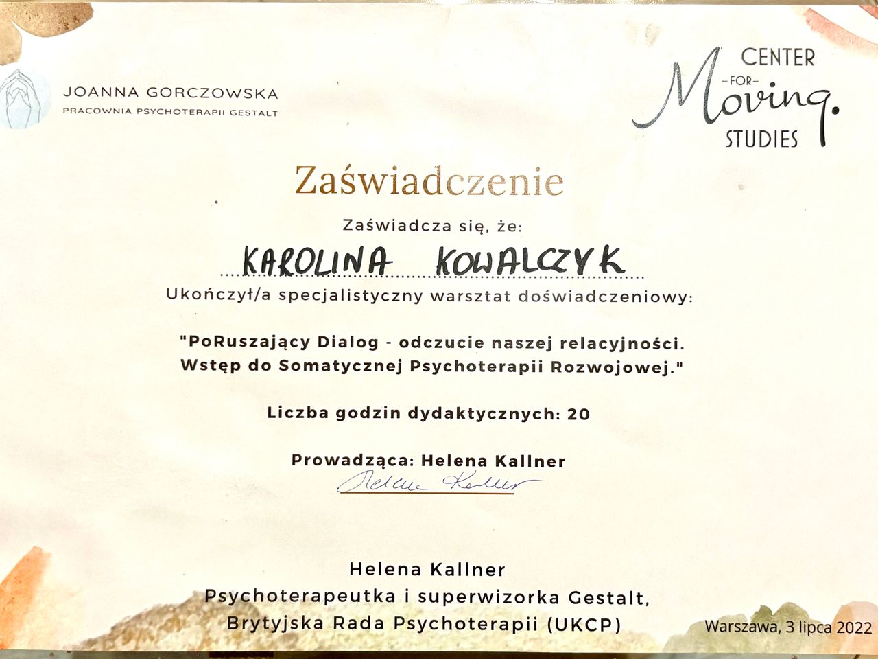 Stale uczestniczę w dodatkowych kursach i warsztatach, między innymi 2-letnim Studium Rozwojowej Psychoterapii Somatycznej w Walencji u Heleny Kallner (DSP™), oraz licznych warsztatach i treningach doświadczeniowych Gestalt m.in. "Praca z parą w nurcie Gestalt" u Petera Philippsona czy "Sztuka kontaktu" z Nurith Levi. W pracy stosuję również doświadczenie wyniesione m.in. z takich kursów jak „Energy for life®”, czy zarządzaniem relacjami w firmie „Meaningful conversations®".