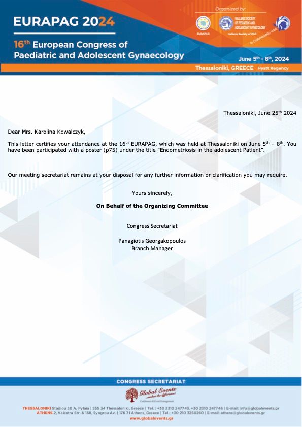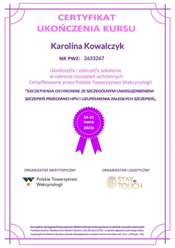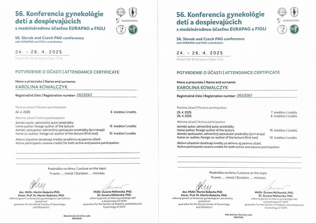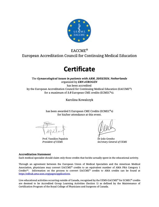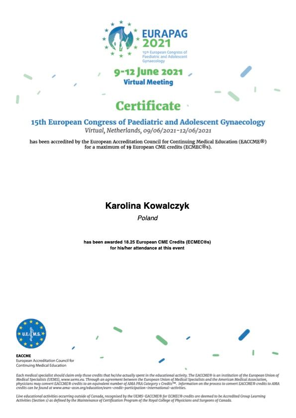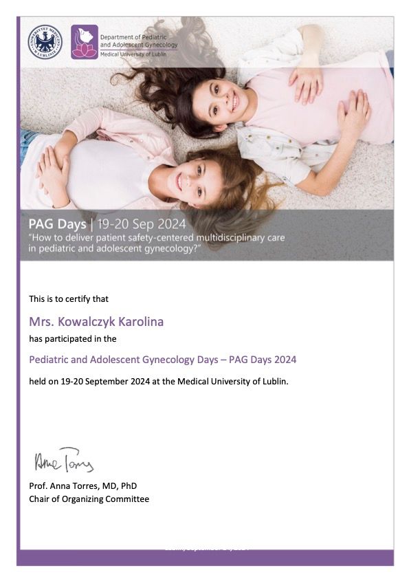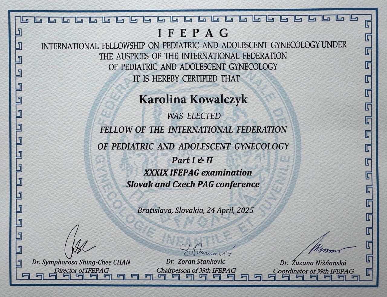 W 2020 r. uzyskałam specjalizację z położnictwa i ginekologii. W 2025 r. zdałam dwuetapowy Międzynarodowy Egzamin Specjalizacyjny z Ginekologii Dziecięcej i Dziewczęcej (IFEPAG - International Fellowship on Pediatric and Adolescent Gynecology). Międzynarodowy egzamin z ginekologii dziecięcej i dziewczęcej traktowany jest jako odpowiednik specjalizacji w tej dziedzinie na całym świecie. Daje uprawnienia do leczenia ambulatoryjnego i zabiegowego dzieci i dziewcząt w każdym kraju. Takie uprawnienia posiada kilkanaście osób w Polsce.